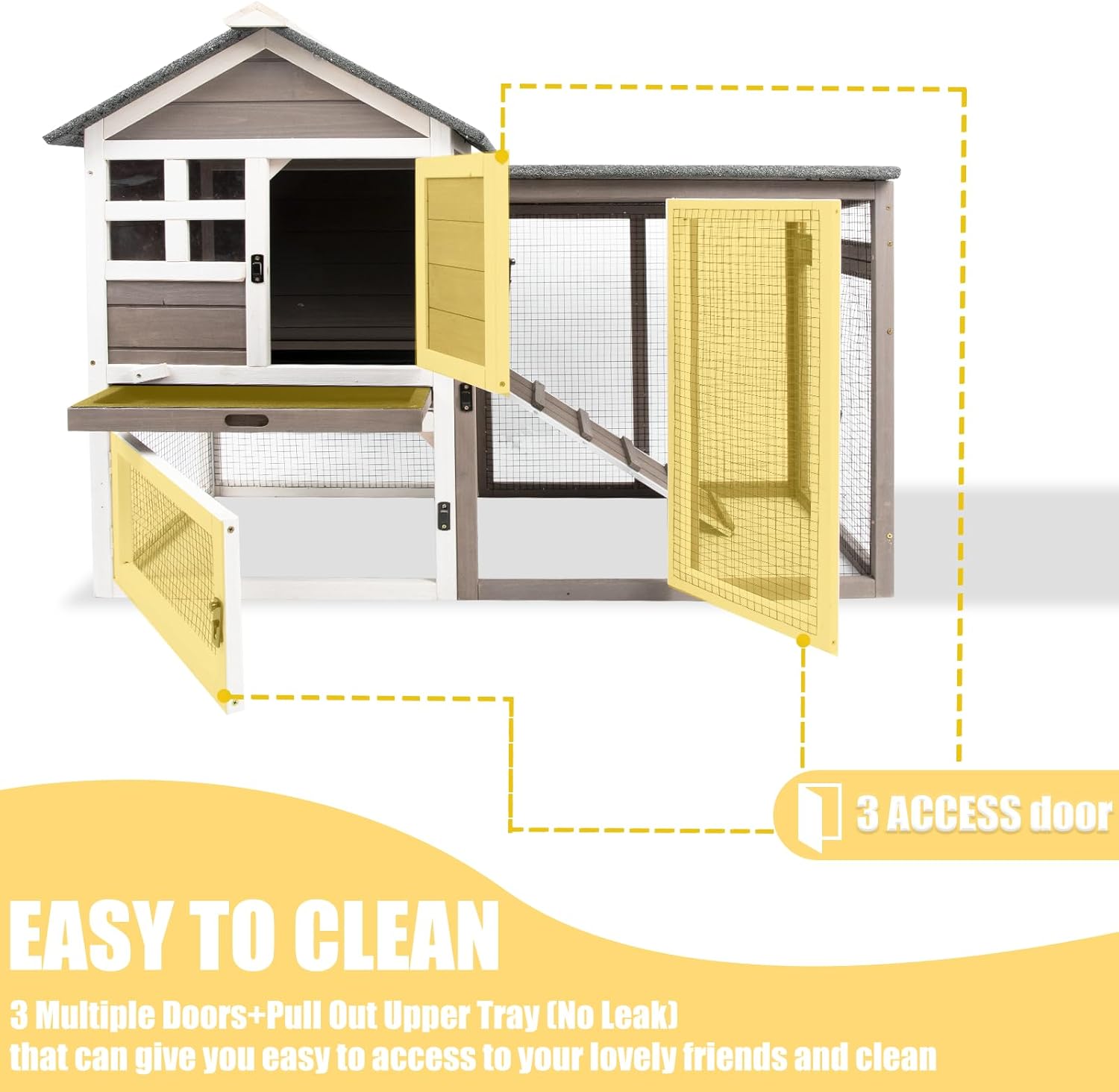 • 🐇【EASY TO CLEAN Pull-out Tray & 3 Entry Doors】 - The Bunny hutch with DEEPER pull out tray make clean easily. Our trays also have a lockable design.We also added a locker for the tray for Enhance the stability and prevent the tray from accidentally falling off.