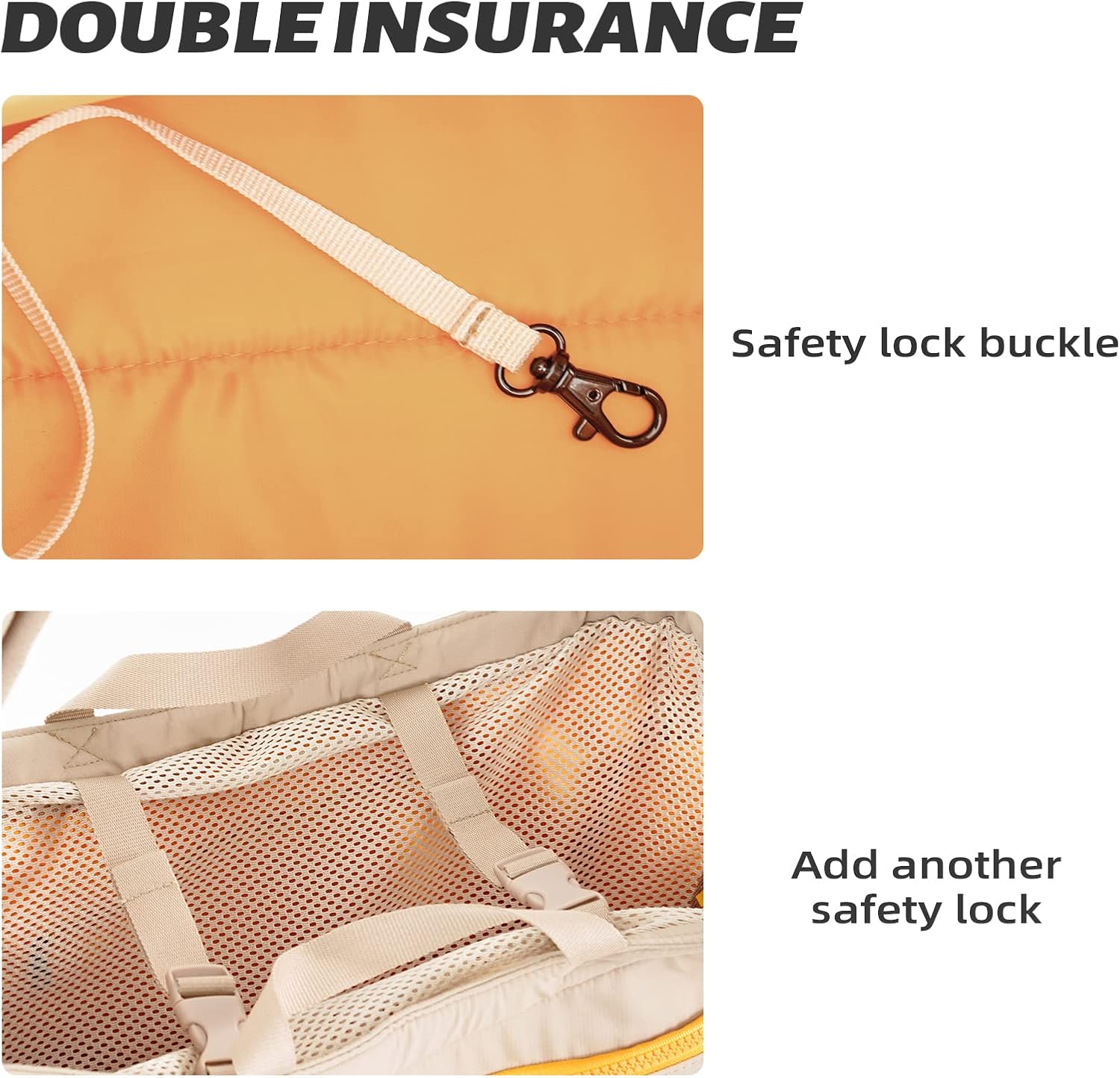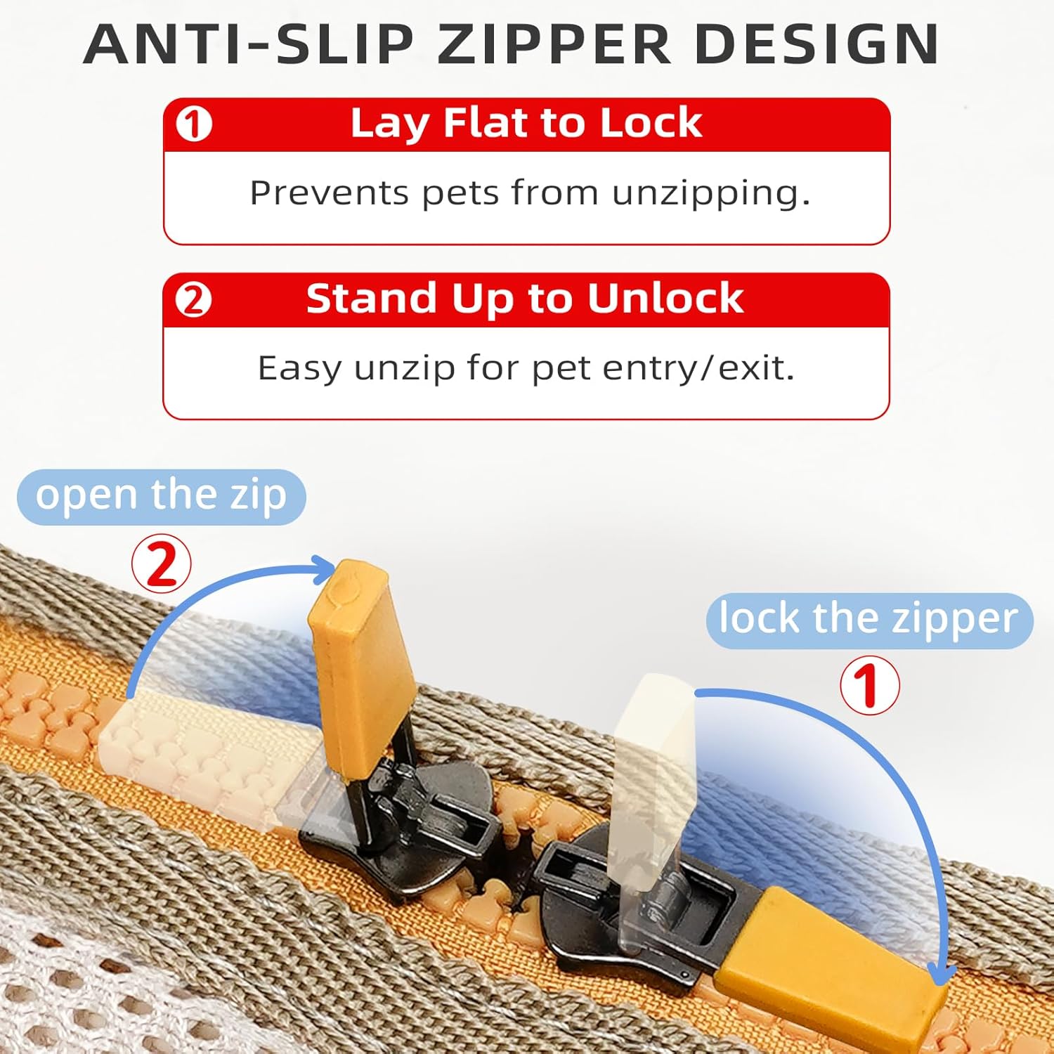 • 【Double escape-proof design:】The pet carrier's zipper features an anti-escape design, which allows it to be easily opened only when the zipper pull is at a 90-degree angle to the zipper teeth. It becomes very difficult to open when the zipper pull is parallel to the zipper teeth. Additionally, there is a safety strap design that can be attached to your pet's chest or collar to prevent escape attempts.
