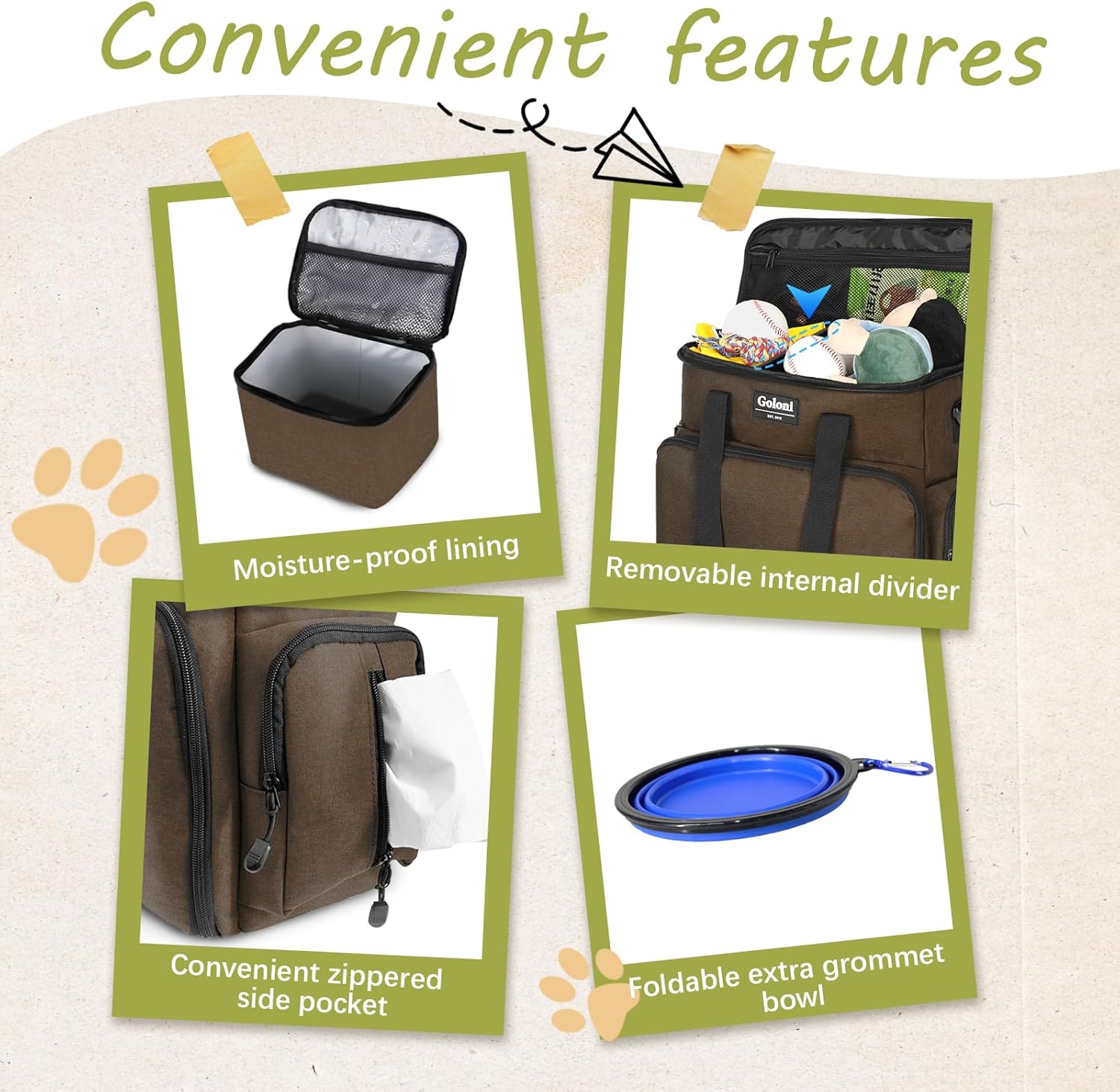 • Smart Storage & Organization – Features multiple pockets, an adjustable flap, and a spacious main compartment to hold food, treats, toys, leashes, and pet essentials—keeping everything neatly in place