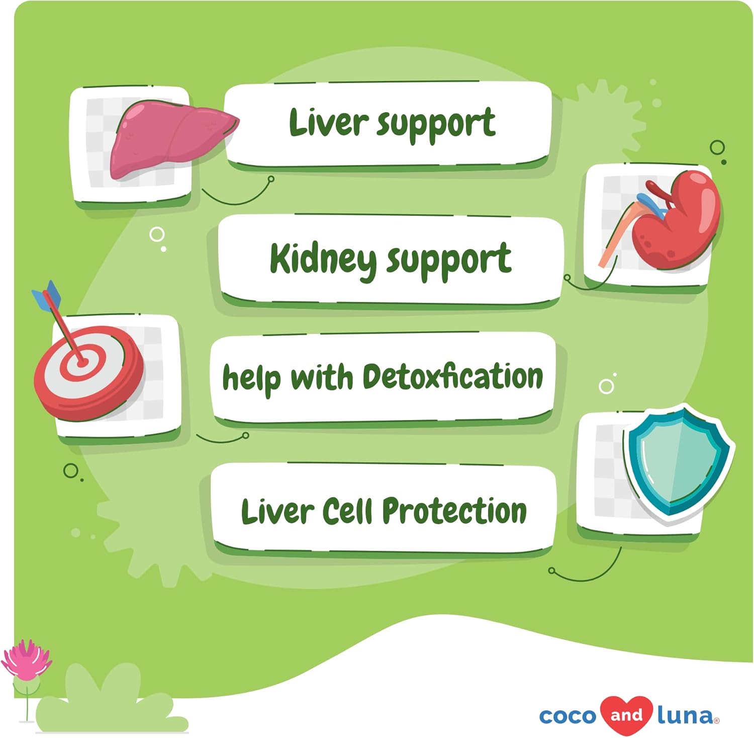 • Organic Milk Thistle for Dogs - Coco and Luna Liver and Kidney Support contains Milk Thistle which is a safe and powerful ingredient that provides liver support for dogs by eliminating toxins and working as a natural dog detox.