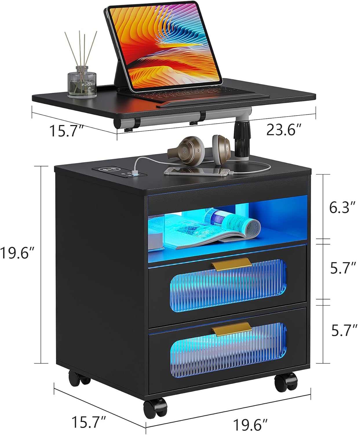 • ✅【Large Capacity Space】 The led nightstand provides spacious storage for nighttime essentials. There is a swivel desk; Open storage shelves; 2 drawers,The desktop can hold everyday items and keep them within reach.
