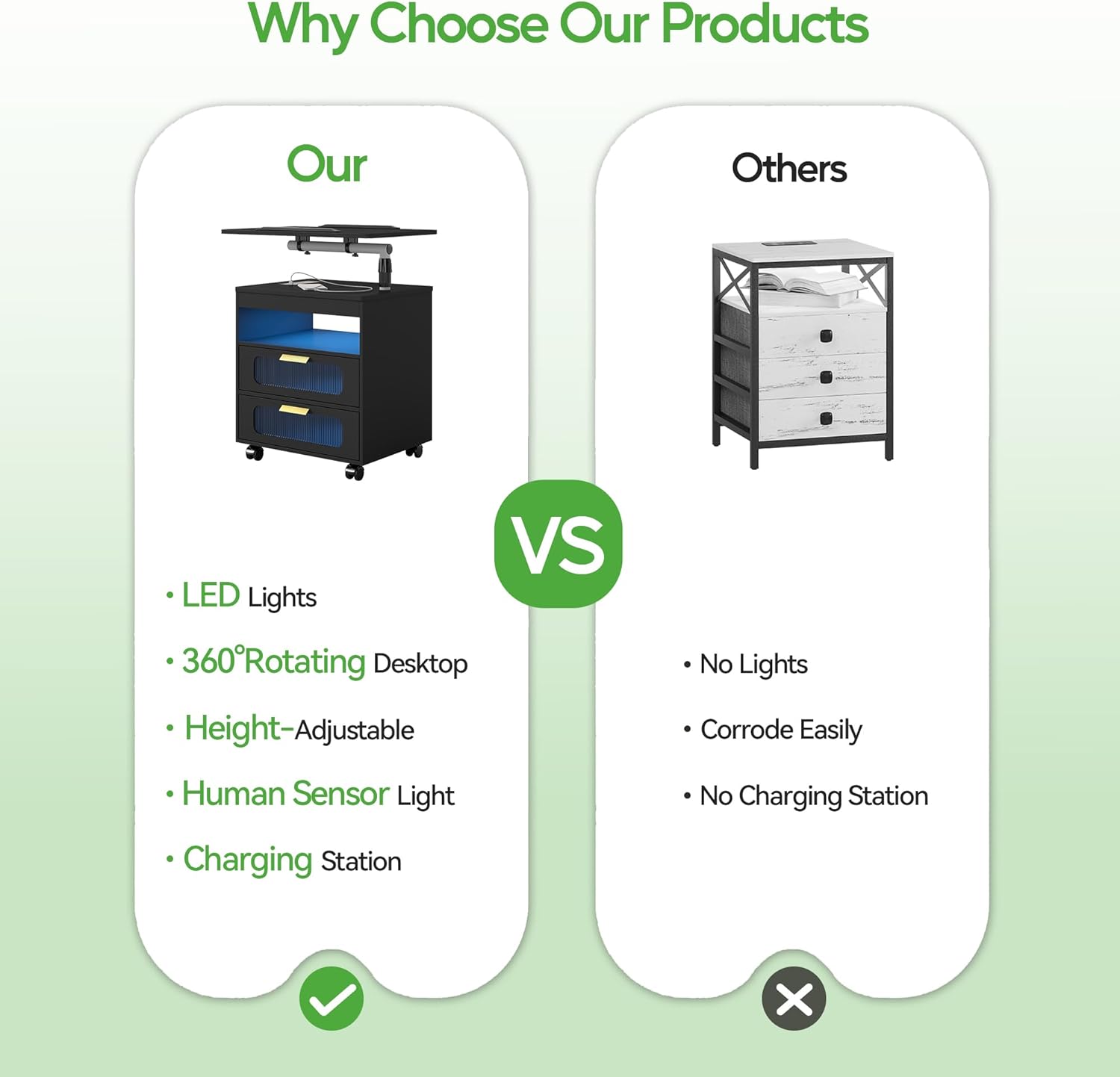 • ✅【Nightstand with Wireless Charging Station】 Bedside table with wireless charging and USB/Type-C charging ports allows you to easily charge your mobile devices, laptops and iPads, making your life easier when you work in bed or on the sofa.