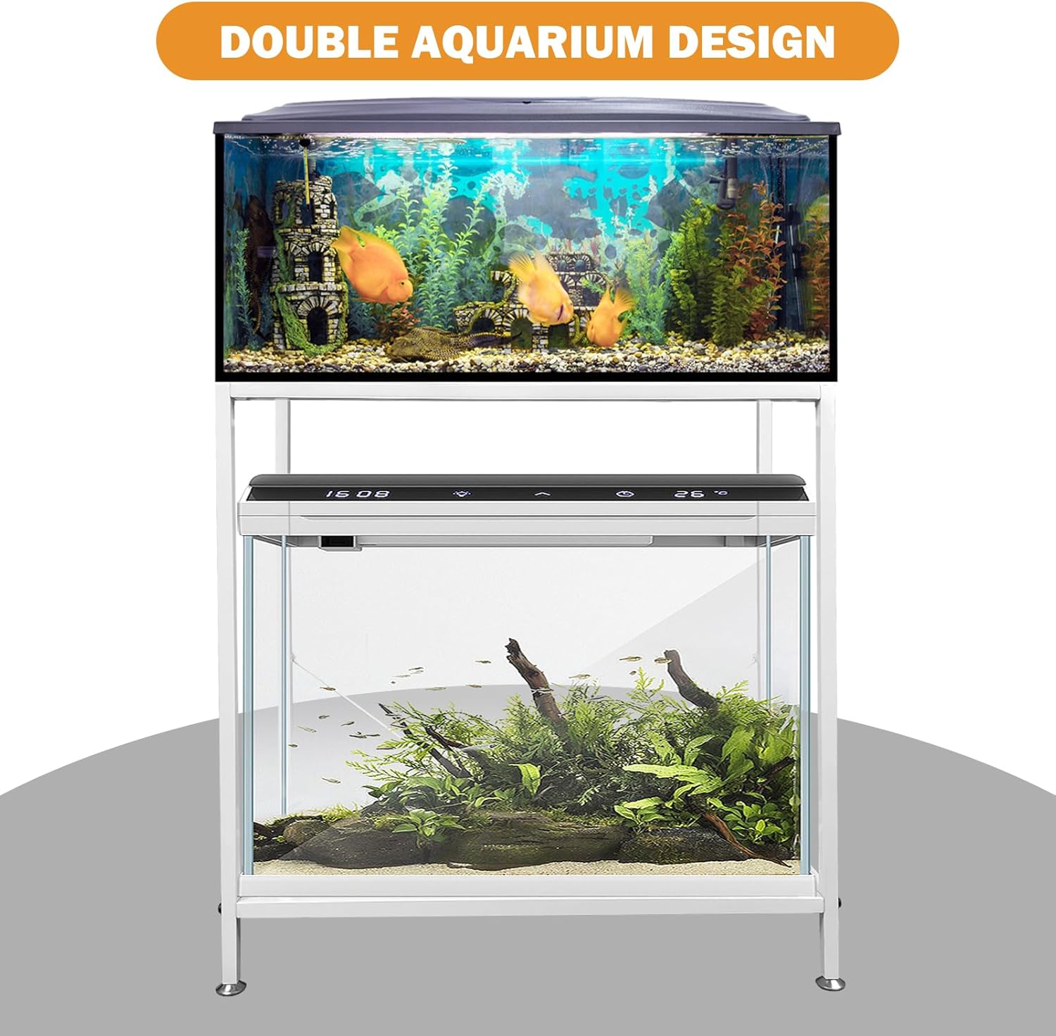 • Double-layered structure: Our Aquarium Tank features a minimalist and stylish design with a double-layered structure that meets your aquarium display needs and provides storage space for pet supplies. Alternatively, you can use it to hold two tanks, bird cages, or other pet habitats.