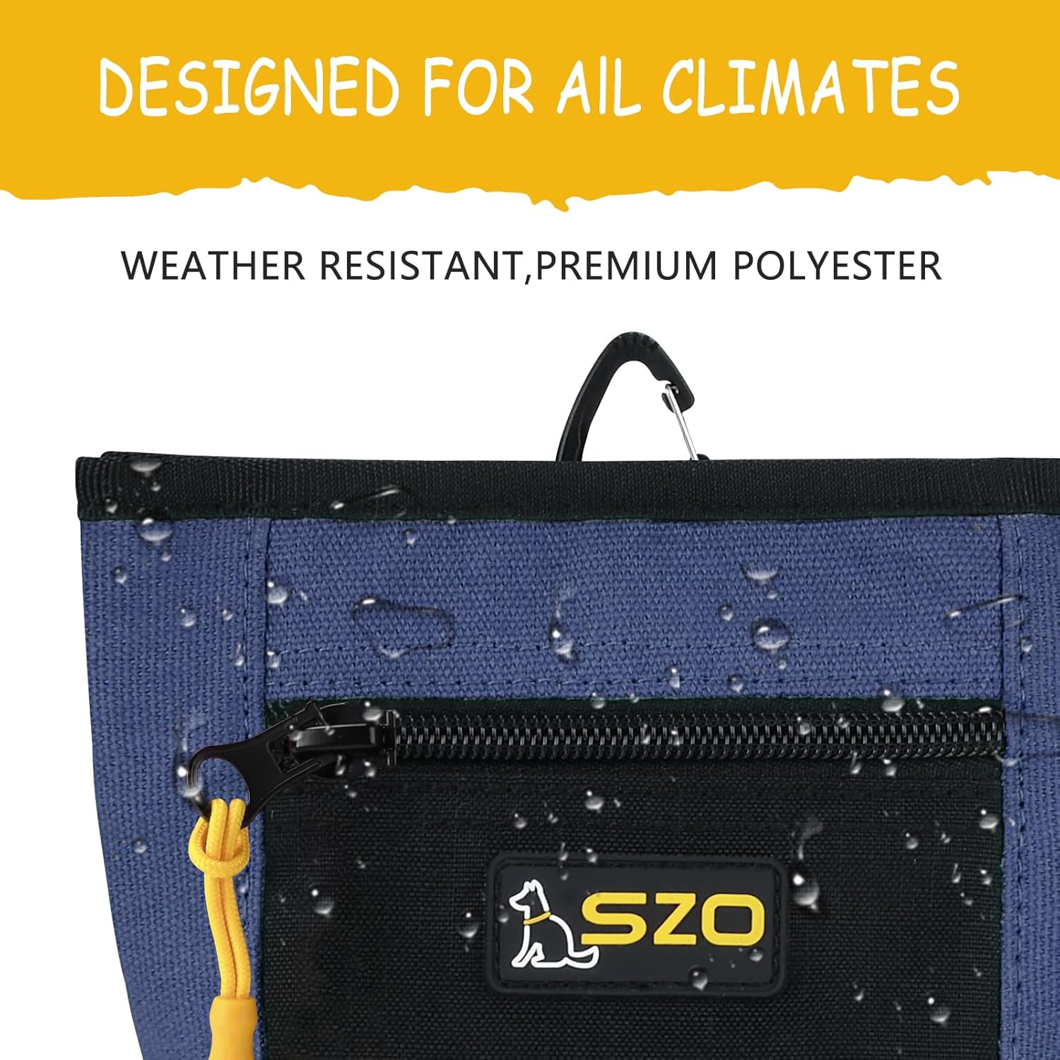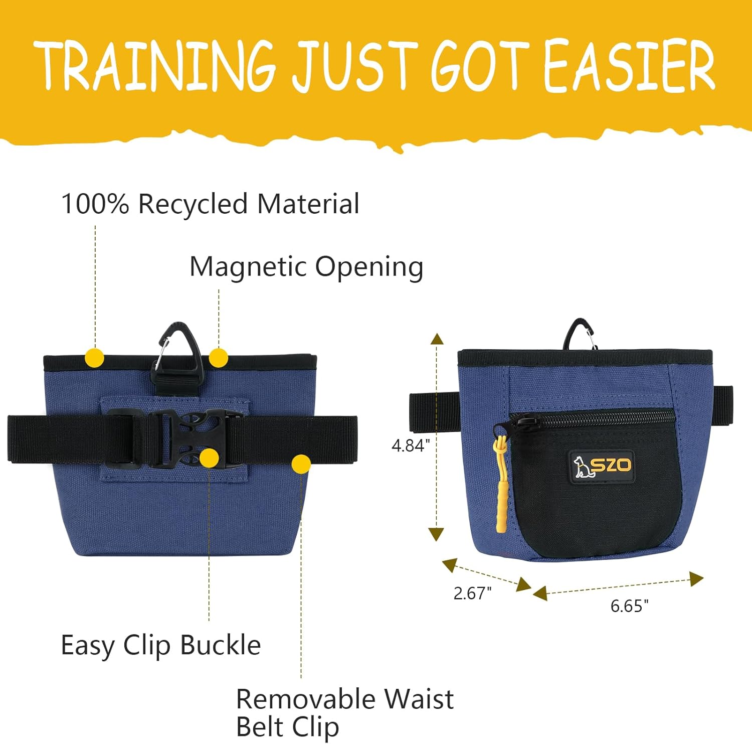 • Easy To Use — SZO dog treat pouch is designed to fit your everyday use when training your pets. It features a magnetic closure, allowing quick and one-handed access to your pet's favorite treats. And a front zipper pocket to secure personal items!