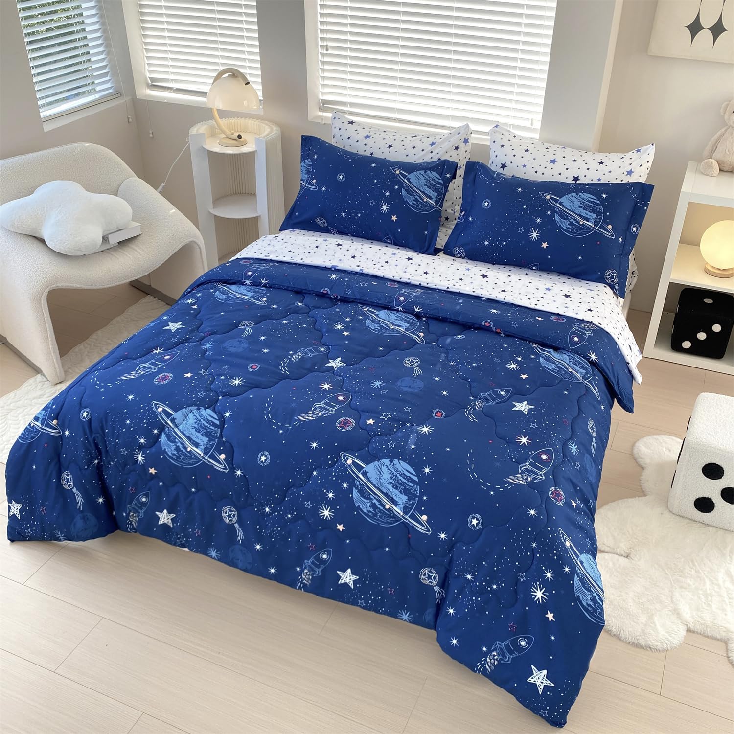 • Cute Space Theme Design: The galaxy comforter is a trend about Exploration of the universe,it is suitable for child,adult or anyone who is curious to the space universe.Mysterious outer space comforter set. Vivid planet design and celestial galaxy pattern on dark blue comforter will give your room a fantasy atmosphere.
