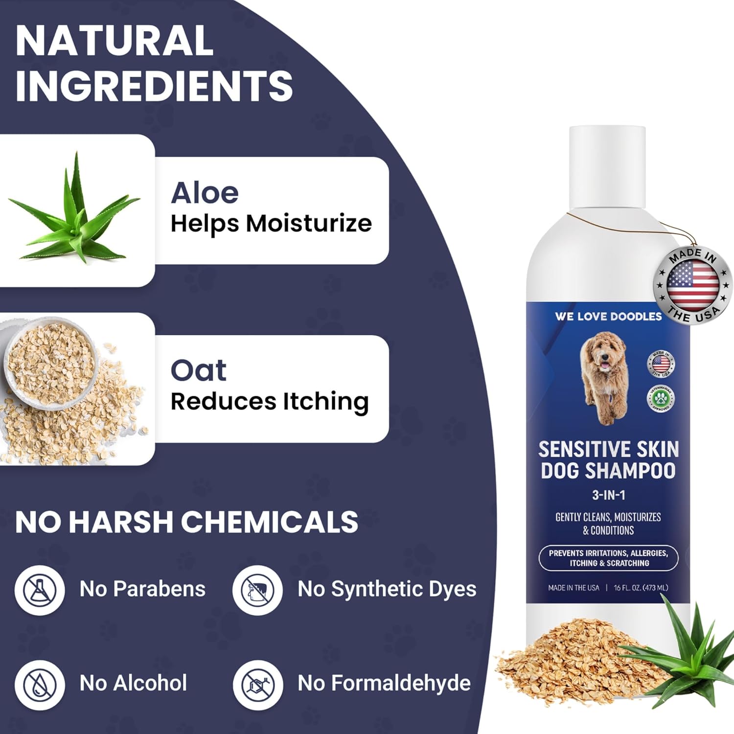 Premium 3-in-1 Sensitive Skin Dog Shampoo, Great for Allergies, Itching, Scratching, Anti-Itch Shampoo for Dogs with Oatmeal & Aloe, Made in USA, Natural Ingredients, 16 oz [We Love Doodles]