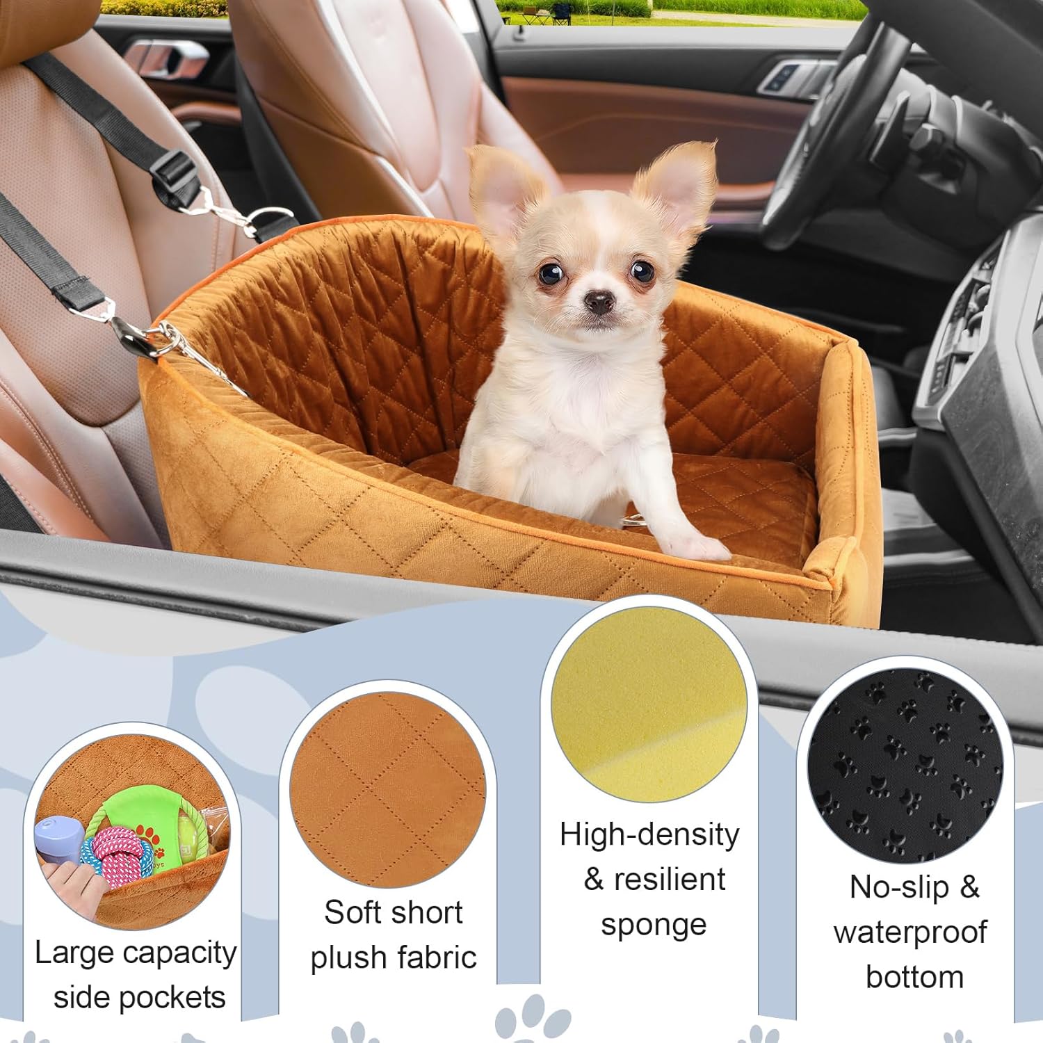 Dog Car Seat for Small Dogs, Memory Foam Booster Dog Seat for Dogs up to 35 lbs, Elevated Pet Car Seat with Washable Removable Cover, Storage Pockets