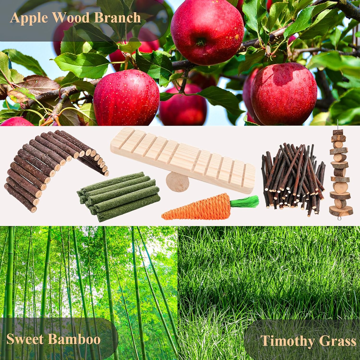 • 【100% Natural Chew Toys】Hamster toys all handmade, safe and harmless to small pet. Quality apple wood and timothy hay sticks for chewing and playing with,rich in nuitrition and vitamins,can help molar teeth ,improve digestion and increase appetite. Hamster chew toys can help the teeth chew and relieve the pressure of the cuties. Gerbil toys to play and molar,keep your lovely pets healthy and active.