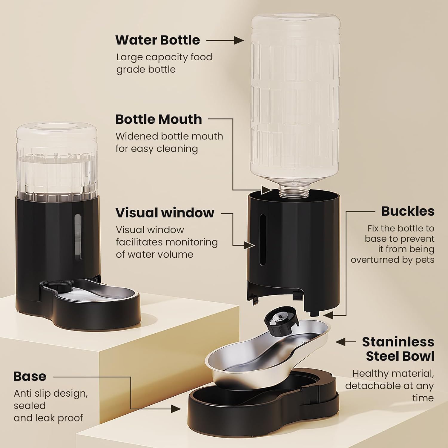 • [Drinking Safe] We take care of pets' drinking water health. The water bowl is fully attached to the base and made of food grade 304 stainless steel. Other components also use pet friendly materials.