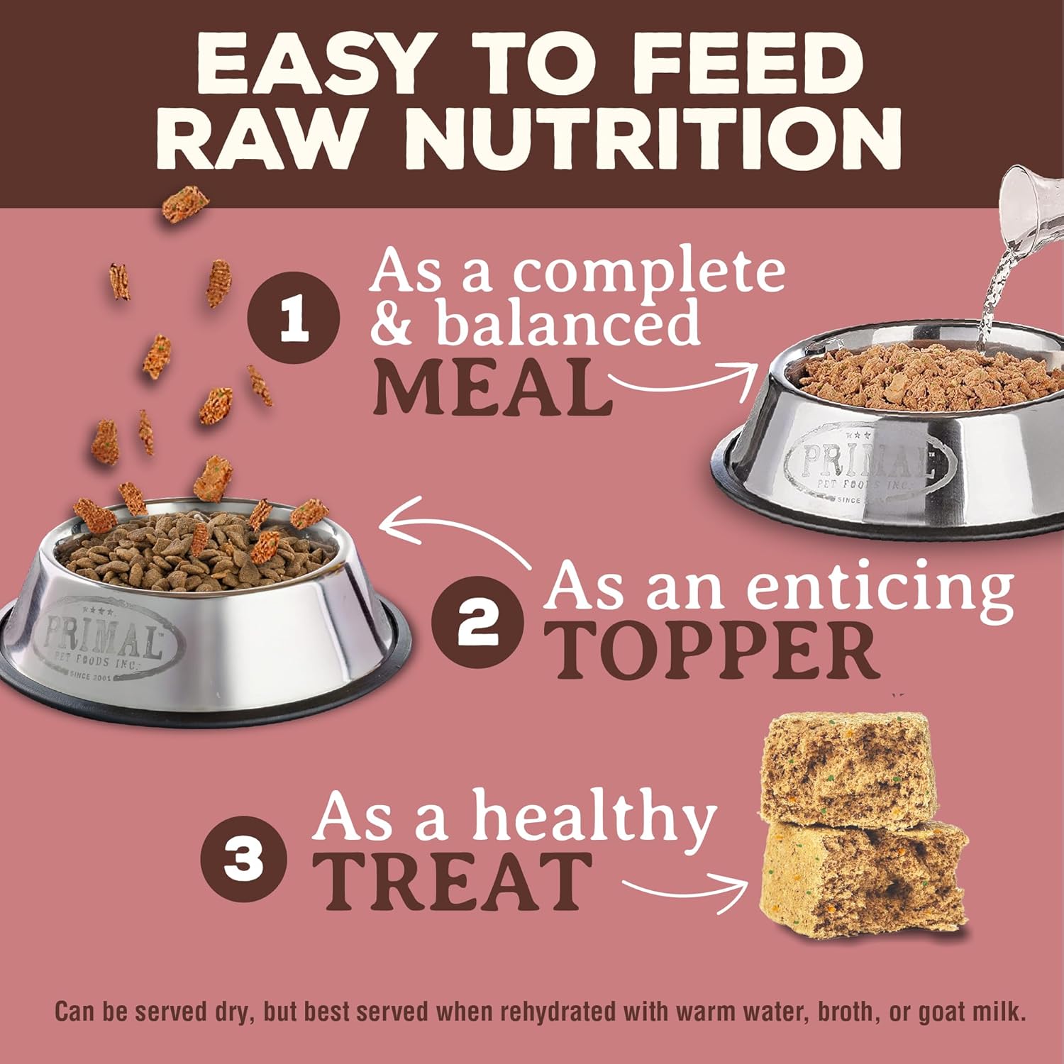 • Serve as a complete & balanced meal, a freeze dried dog food topper or treat. Adding Primal Pet Food just a few times a week will help you start to see the results raw food for dogs can provide