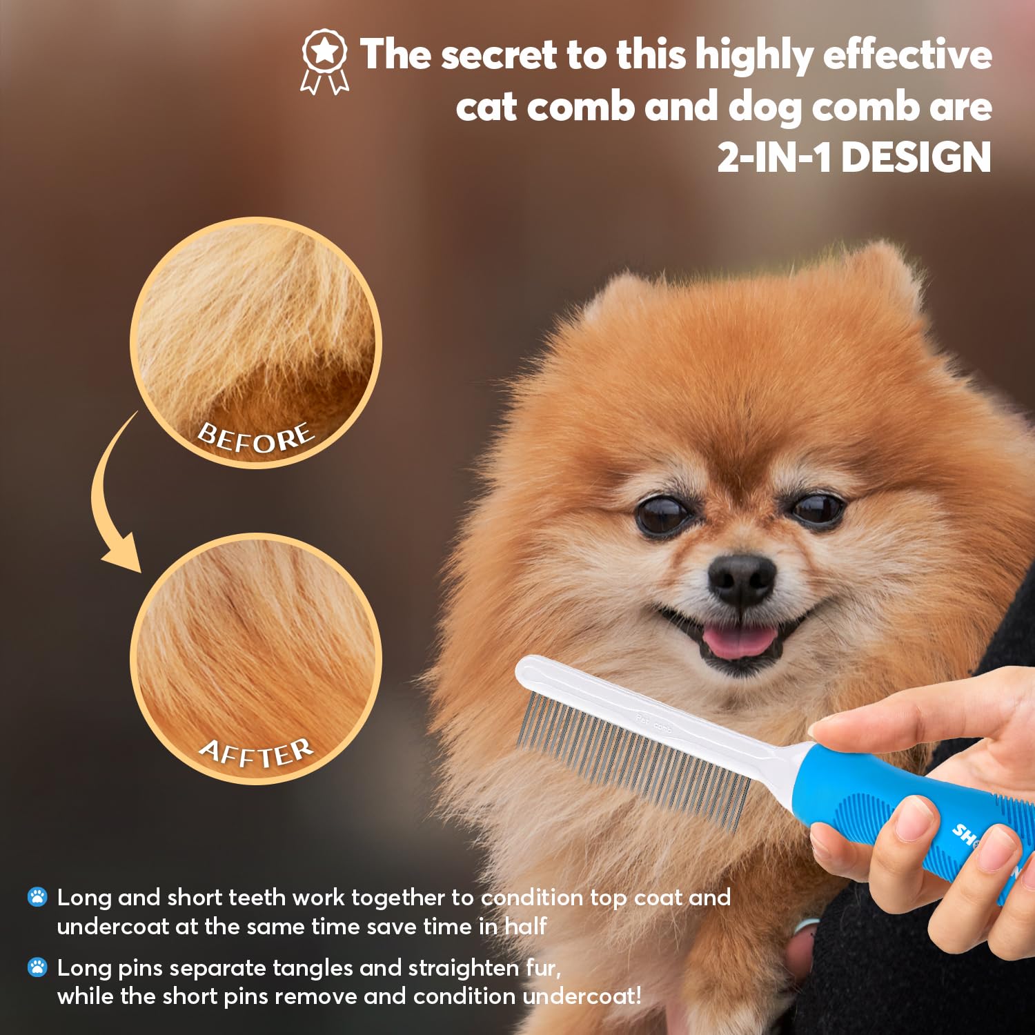 • PROFESSIONAL DOG & CAT GROOMING COMB specially designed long and short metal teeth groom your pet's top coat and undercoat at one time. Long pins separate tangles and straighten fur, while the short pins remove and condition undercoat!