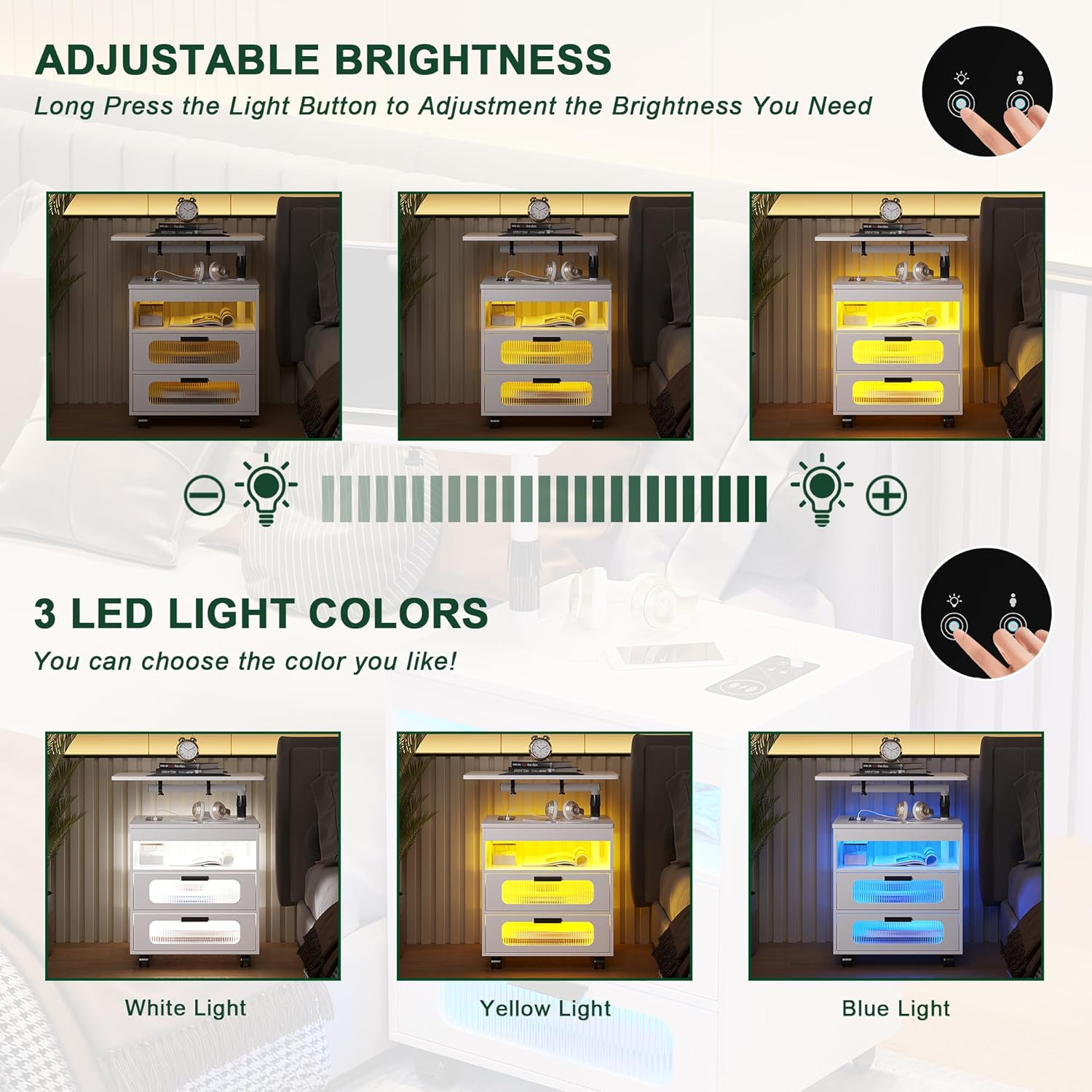 • ✅【Large Capacity Space】 The led nightstand provides spacious storage for nighttime essentials. There is a swivel desk; Open storage shelves; 2 drawers,The desktop can hold everyday items and keep them within reach.