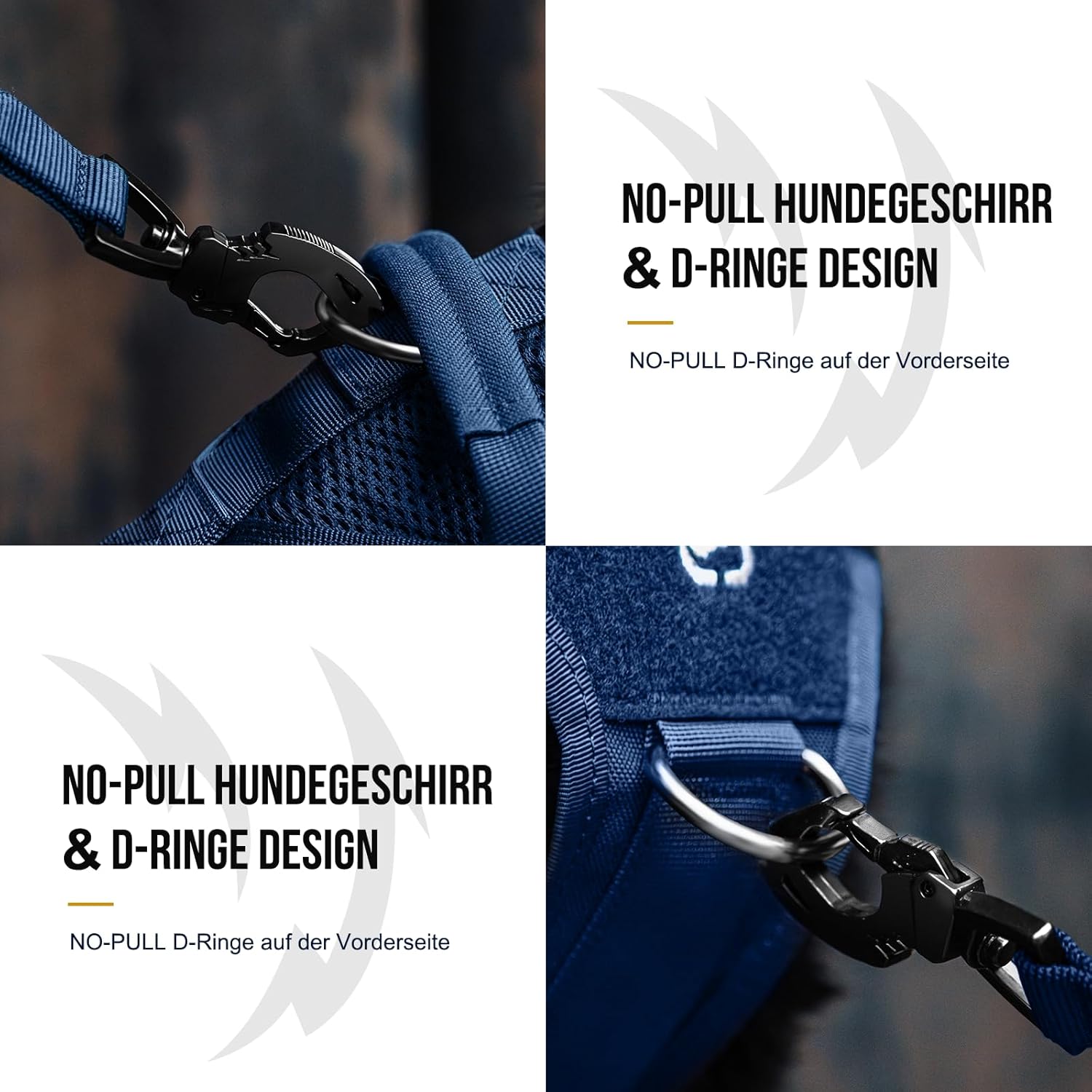 • [No Pull D-ring]: 3 stainless steel D-rings at the front chest and back for training, short and long leashes, with 4 UTX-Duraflex quick-release buckles and 6 fully adjustable straps.