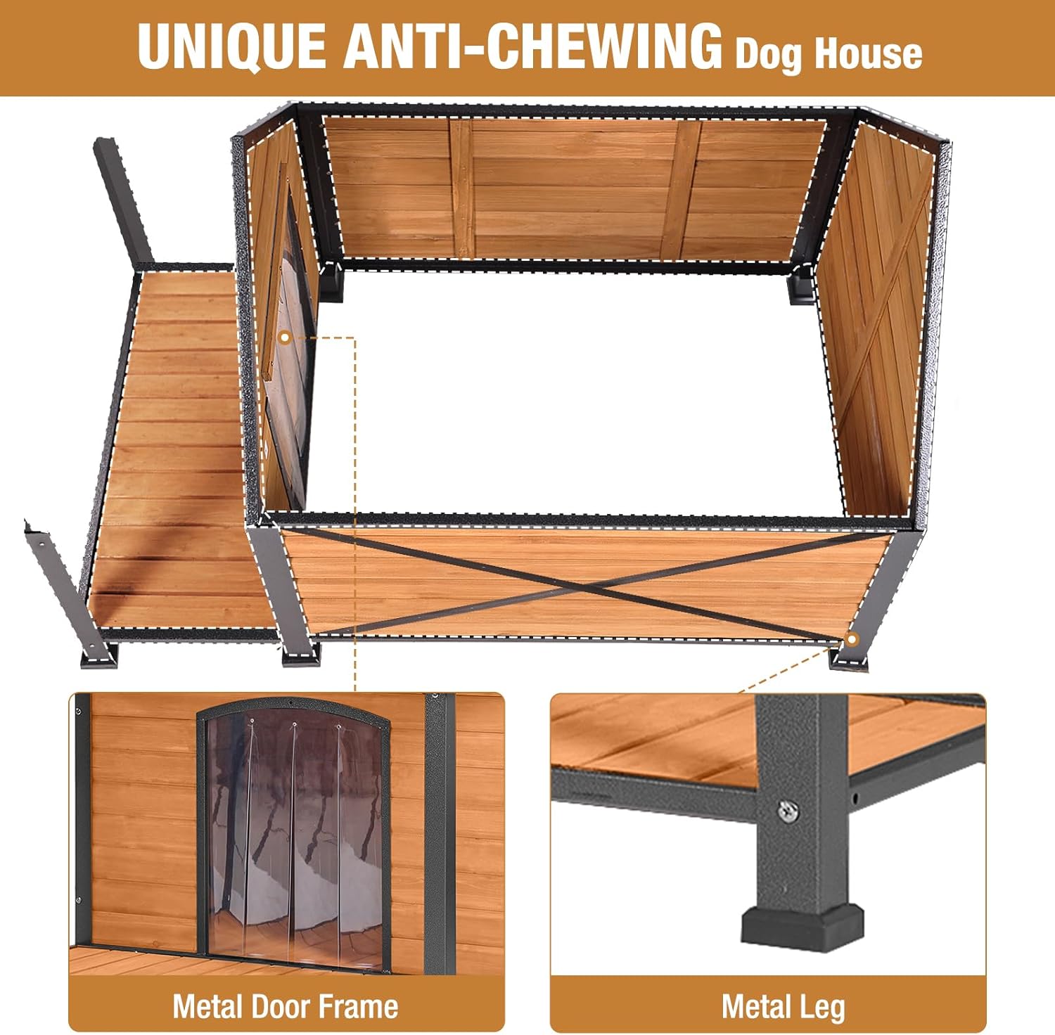 • 【Strong & Durable】Our dog house Combine with solid wood and UNIQUE all-around stronger iron frame, prevent destruction and chewing from animals. Anti a 180-pounds adult can easily sit on the platform.