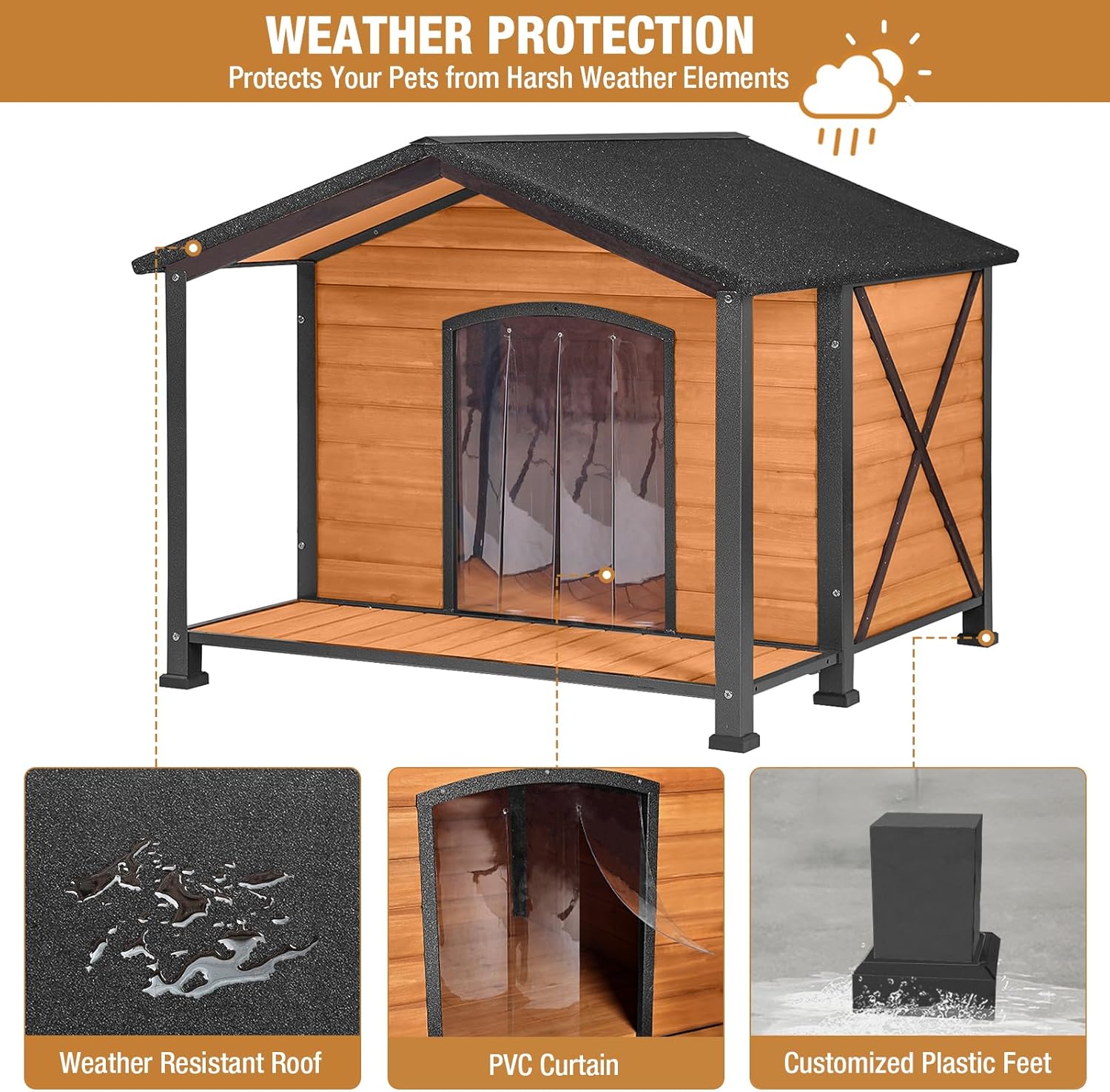 • 【Weather & Water Resistant】Cabin Dog house with security waterproof paint, raised floor with customized plastic waterproof feet pad & asphalt roof & high quality curtain provide protection from the elements and keep the cabin comfortable & dry.