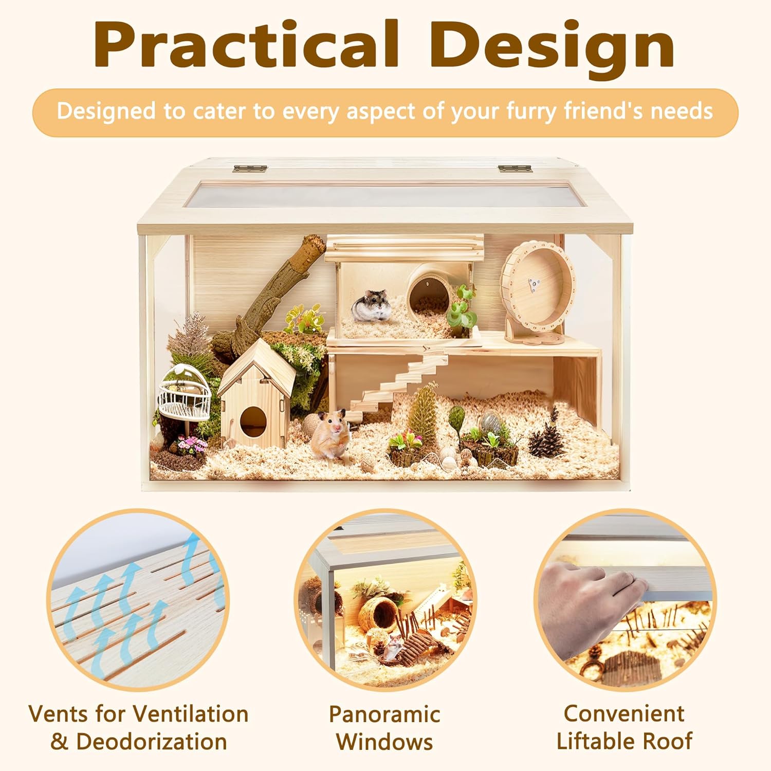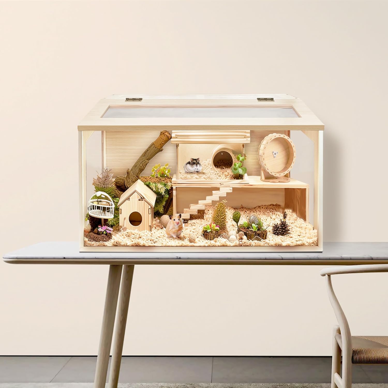 • 【Premium Craftsmanship】Our hamster enclosure is expertly constructed from strong, high-density natural wood with a corrosion-resistant and waterproof coating, ensuring it remains resistant to moisture and corrosion. The cage's windows are made from transparent acrylic, enabling you to maintain a clear view of your hamster's activities