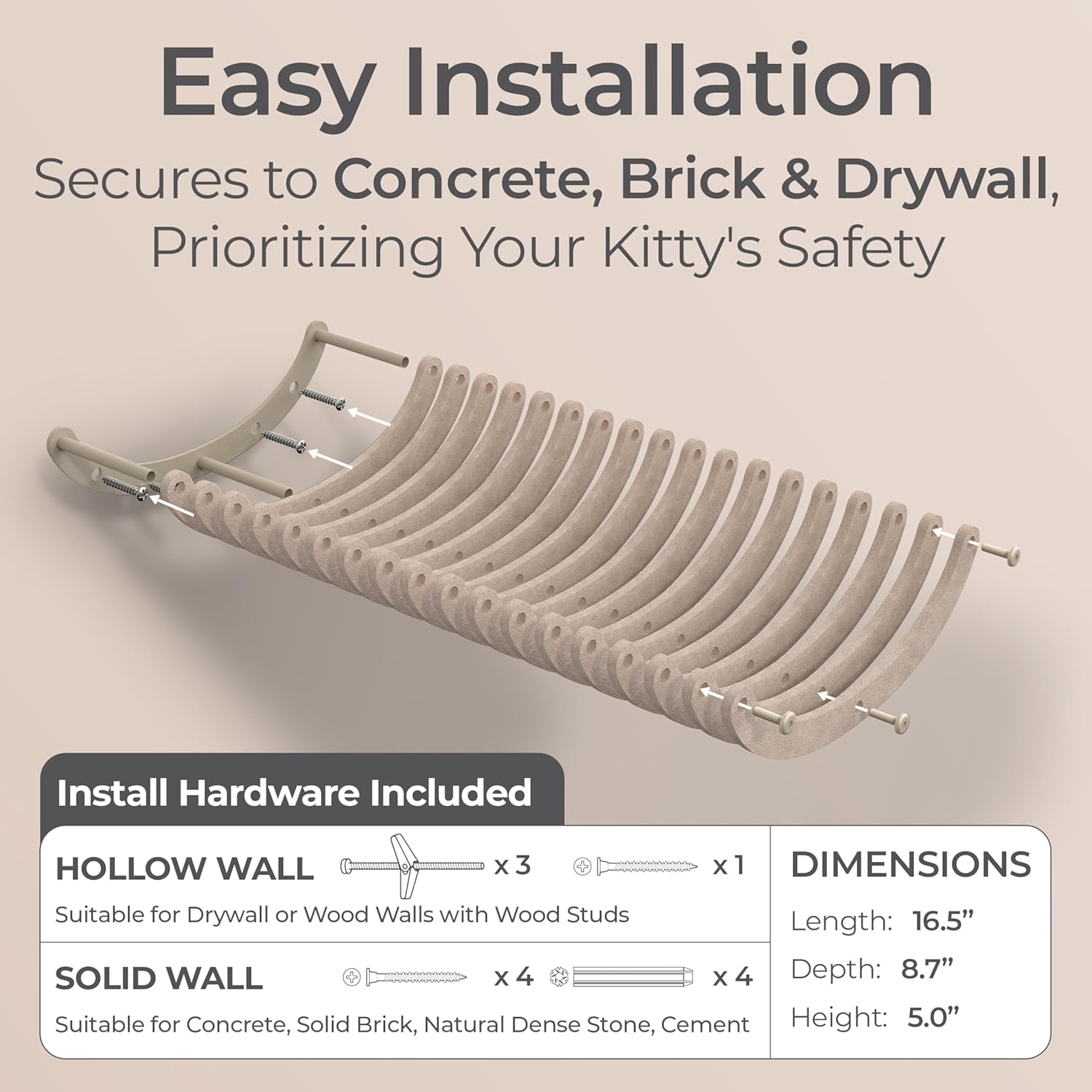 • Effortless Paradise: This cat hammock and wall bed includes all installation hardware, allowing your fur-baby to start exploring right away. Our cat climbing shelf securely attaches to concrete, cement, brick, dry wall and more ensuring your cat’s safety.