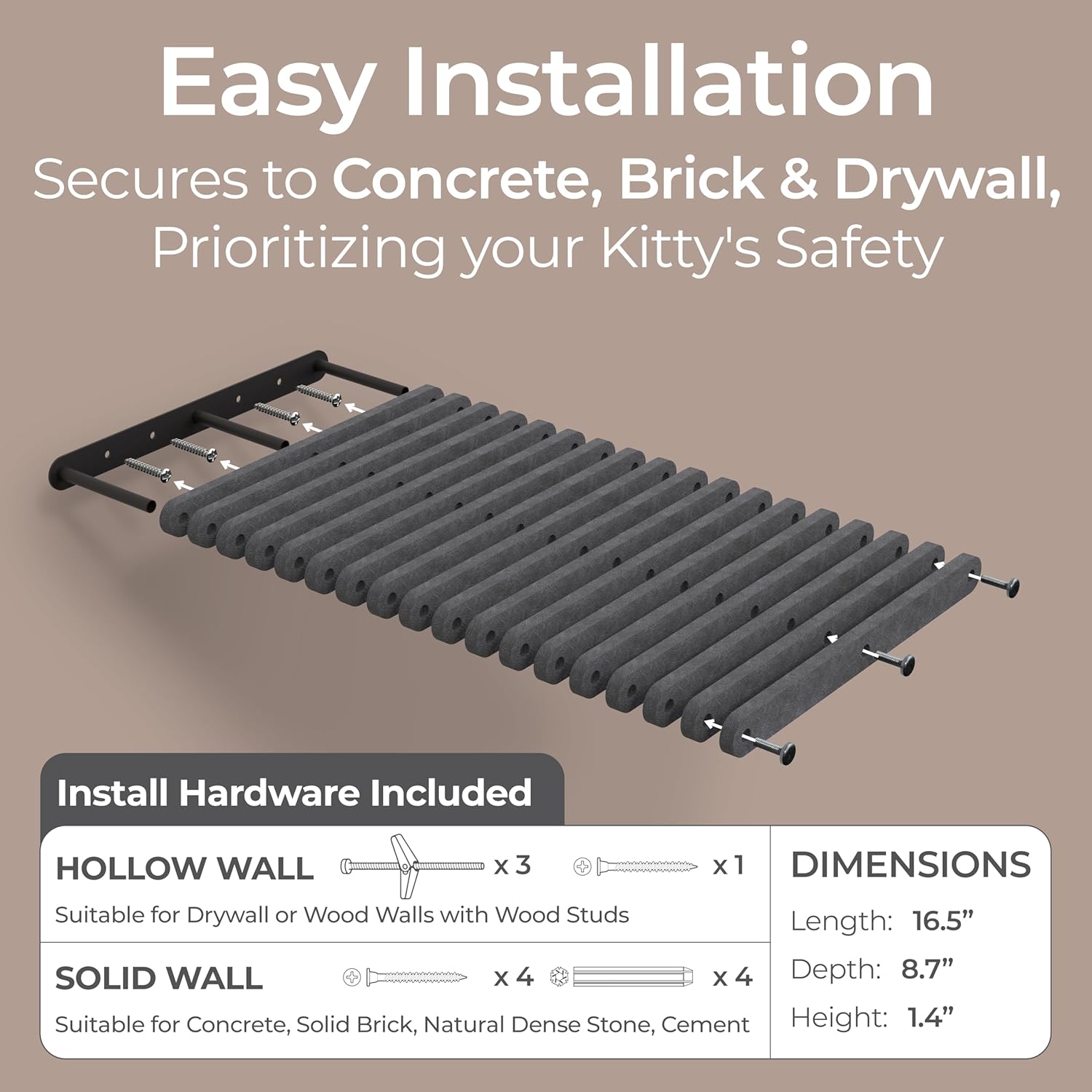 • Effortless Paradise: This cat wall bed includes all hardware, allowing your fur-baby to start exploring right away. Our cat climbing shelf securely attaches to concrete, cement, brick, dry wall and more ensuring your cat’s safety.