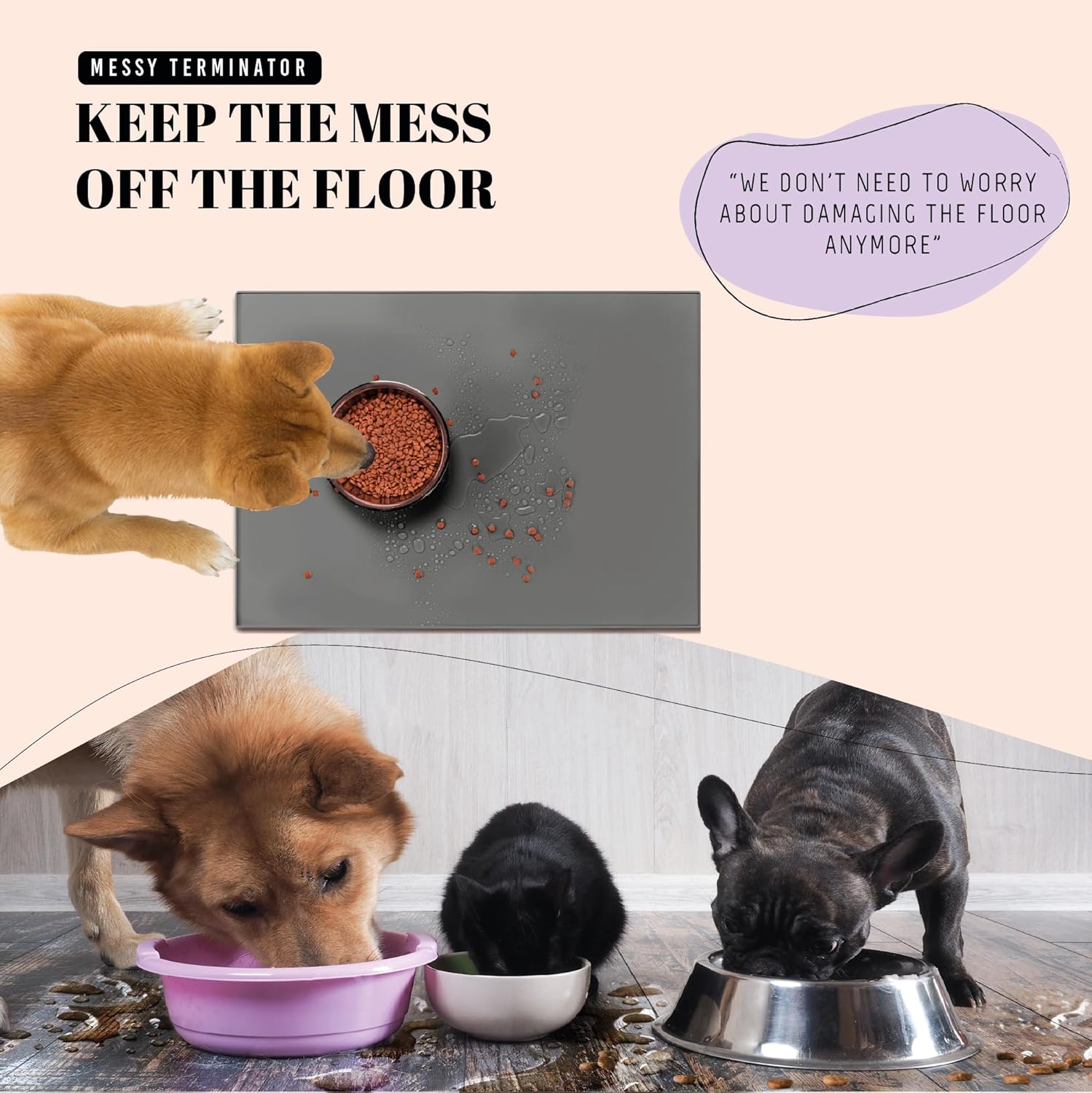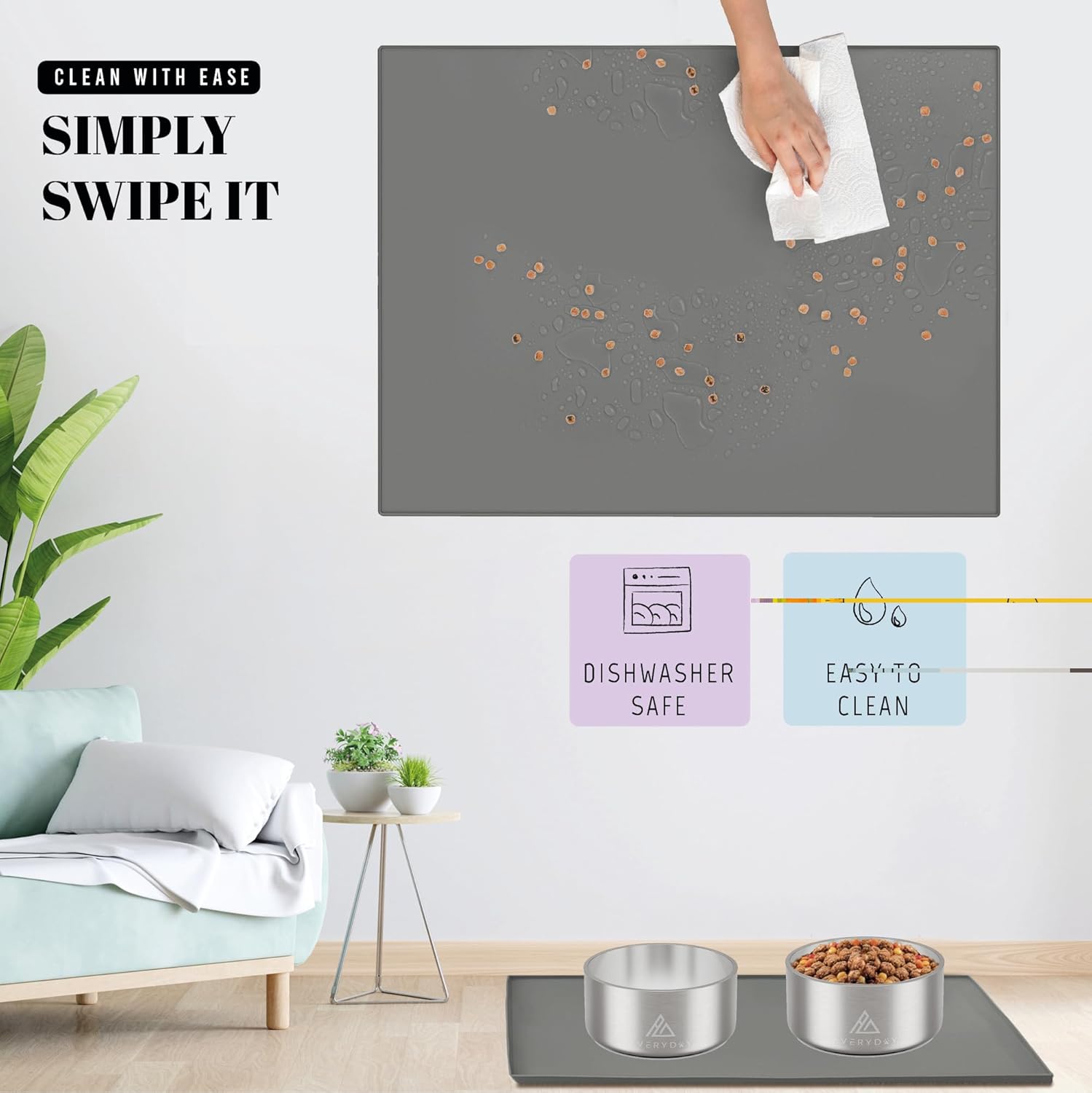 • Non-Slip Design: No more sliding bowls! AVERYDAY's heavy-duty pet mat stop bowls from sliding during meals. The dotted surface boosts slip resistance, ensuring your pets' food and water bowls stay securely in place