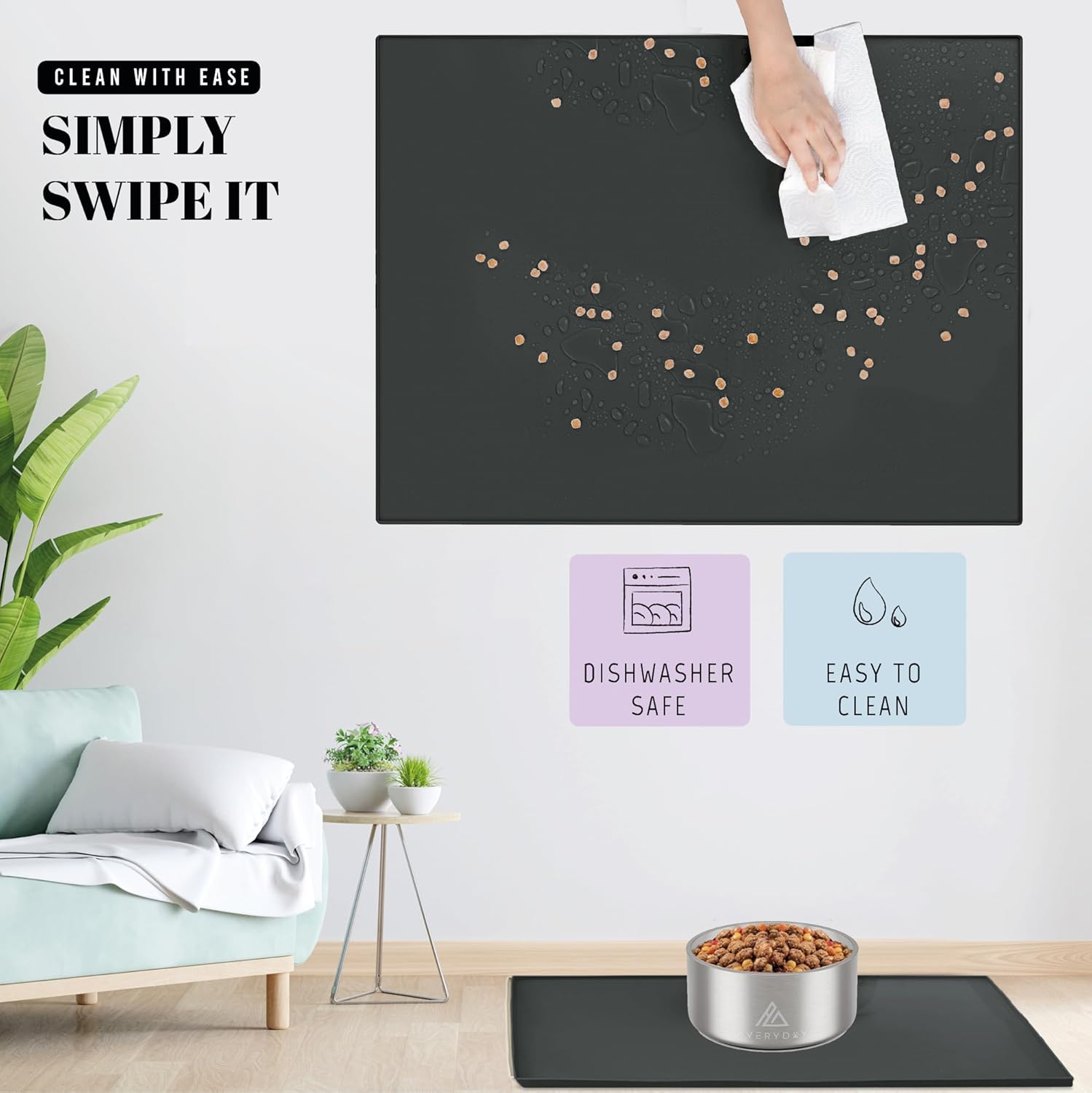 • Non-Slip Design: No more sliding bowls! AVERYDAY's heavy-duty pet mat stop bowls from sliding during meals. The dotted surface boosts slip resistance, ensuring your pets' food and water bowls stay securely in place