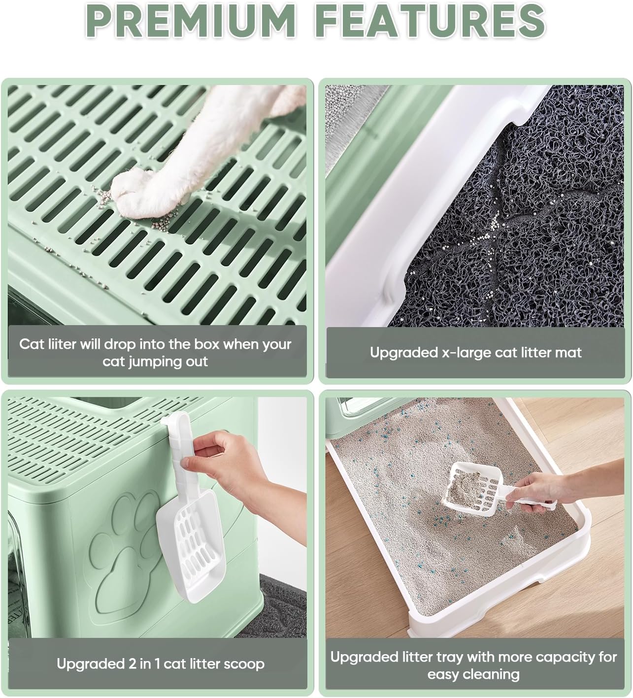 Cat Litter Box with X-Large Litter Mat and Scoop, Large Foldable Litter Box with Lid, Enclosed Kitty Box,Front Top Entry Exit, Odor Control Easy to Clean (Upgrade Green)
