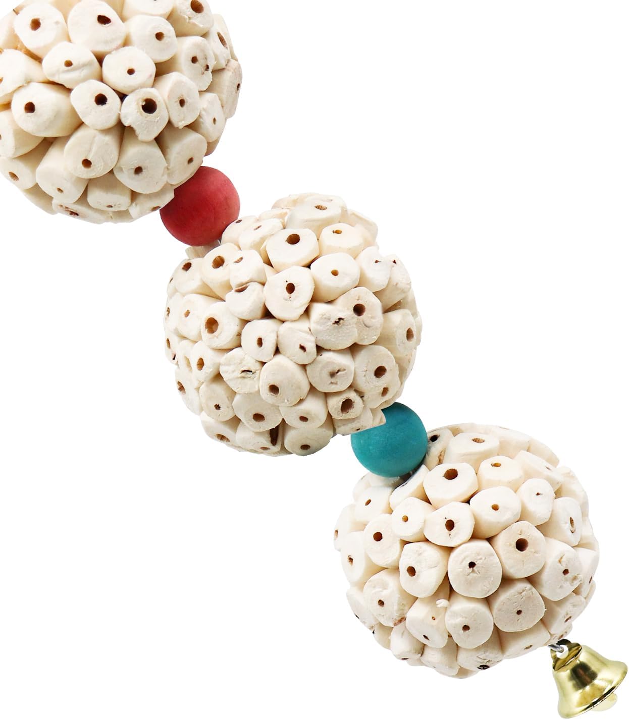 • Colorful and Auditory Delight: Each parrot chewing toy string comprises 6 sola balls separated by colorful wooden beads. At the bottom, a metal bell adds an auditory element, creating a pleasant sound when the bird indulges in chewing—an enticing and multi-sensory experience.