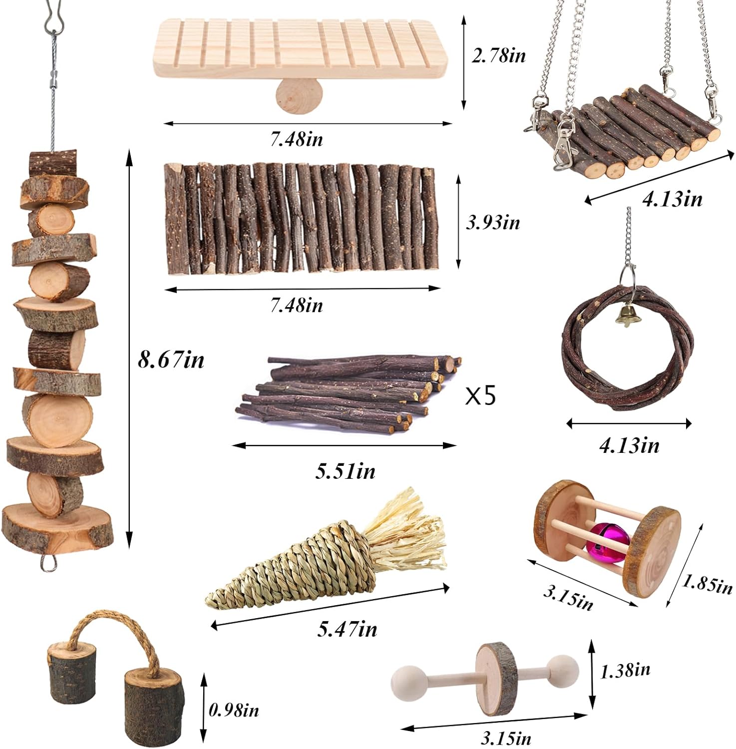 • 【10 Modles of Chew Toys】The hamster toys set includes Seesaw, wooden ladder bridge, apple branch Molar string,unicycle,grass carrot toy,Bell Roller,apple wood sticks, apples wood dumbbell,apple wood hammock,apple wood ring swing. Great enrichment set for hamster,guinea pig,chinchilla.Rat cage accessories are a great way to provide your rats with fun and stimulating toys to enhance their environment.