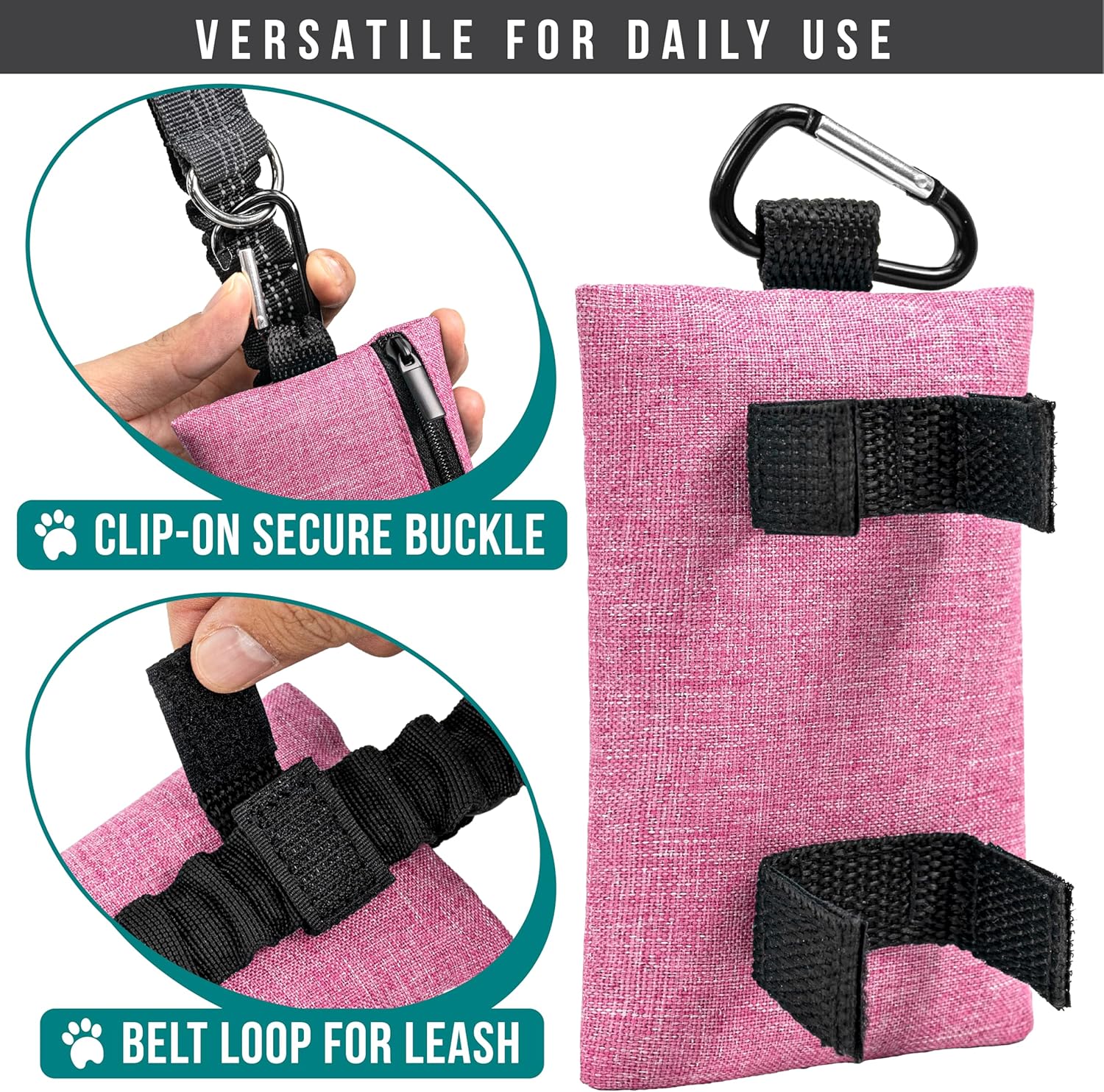 • POOP BAG DISPENSER FOR LEASH: Poop bag holder clips and attaches to any leash or velcro secures to your dog's harness. Perfect pet essential dog walking pouch with zipper storage to hold dog accessories, small treats and extra poop bag rolls.