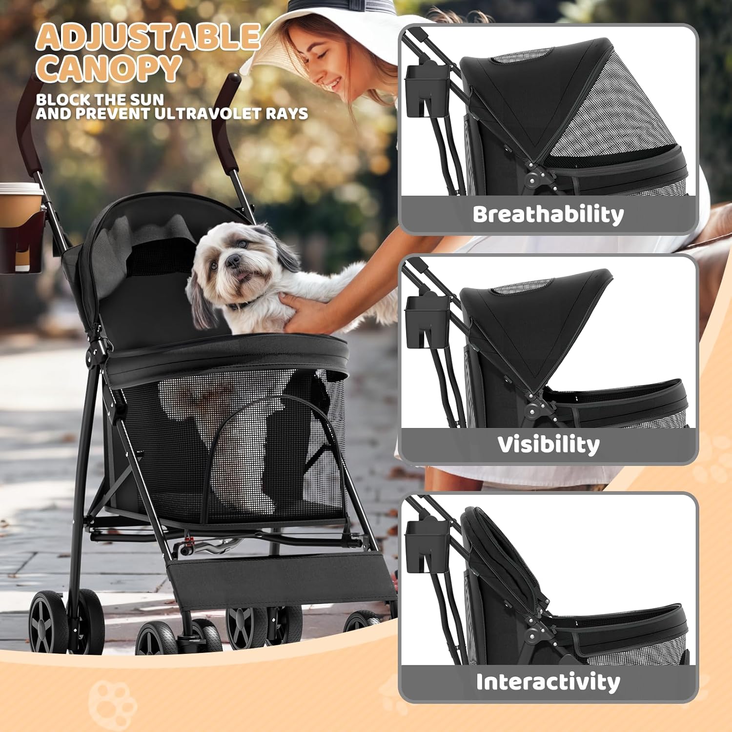 • Adjustable Comfort & Easy Access : This pet stroller features an adjustable canopy and breathable mesh windows for maximum airflow and shade. The spacious padded interior and dual-entry zippered doors let pets easily hop in or out, making every ride cozy and stress-free