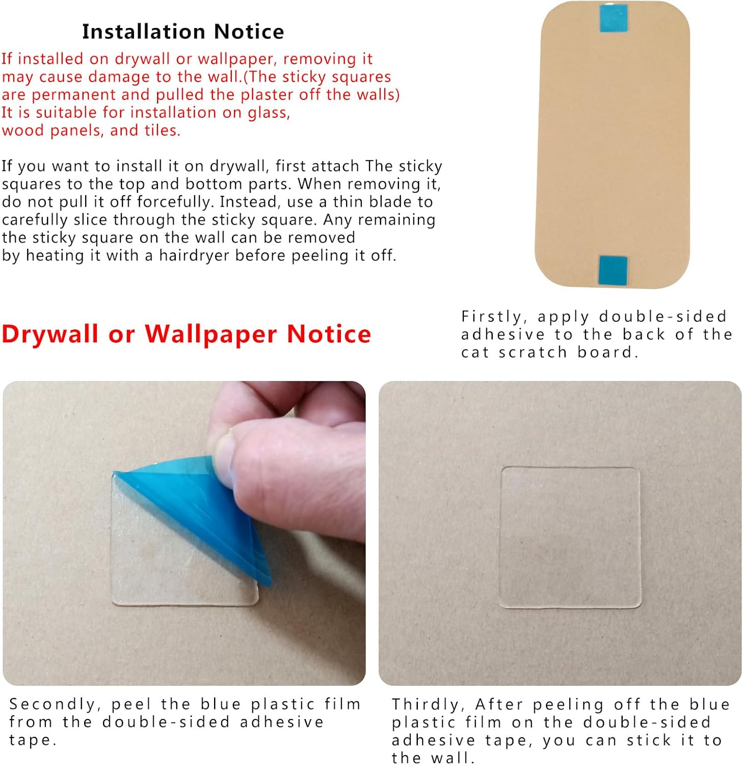 • 【EASY TO INSTALL】You can install it with two pieces of double-sided tape. And you can easily stick it to walls, doors, glass, and tiles. This Wall Cat Scratcher includes 8 pieces of double-sided adhesive tape. Perfect for all cat sizes. For larger cats to stretch their legs and hindquarter muscles, hang the scratcher higher up the wall. For smaller cats, hang it lower.