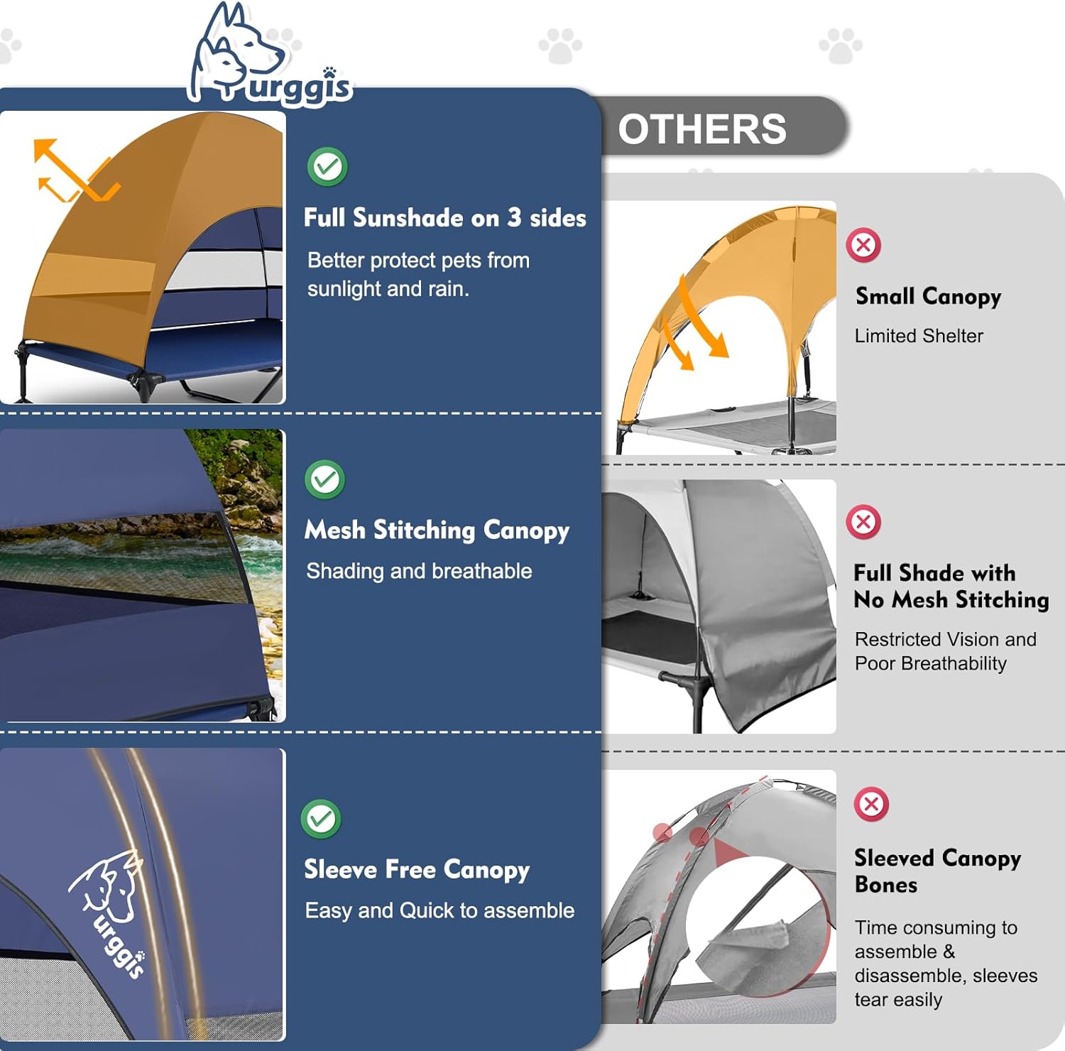 - Elevated Pet Cot With Anti-Scratch Breathable Bed Mat: Features a high density teslin breathable meshing bed mat, this bed is anti-scratch, breathable and odorless, no sticking hair and can be easily cleaned up by wiping or hosing off and keep clean. With this elevated dog bed with a large canopy, our furry kids will be better protected from ground heat and scorching sun in summer and keep dry in light rain (cover is recommended in heavy rain), let them have a cozy summer!