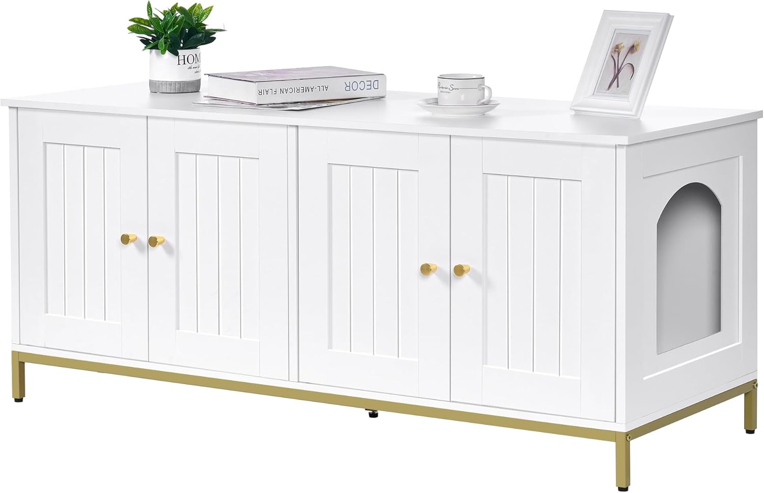 • Modern style: The cat litter box cabinet features white finish and metallic gold-colored metal frame, adding an elegant and stylish touch to your home decor. Its minimalist design and exquisite detailing inject a touch of luxury and sophistication into your living space