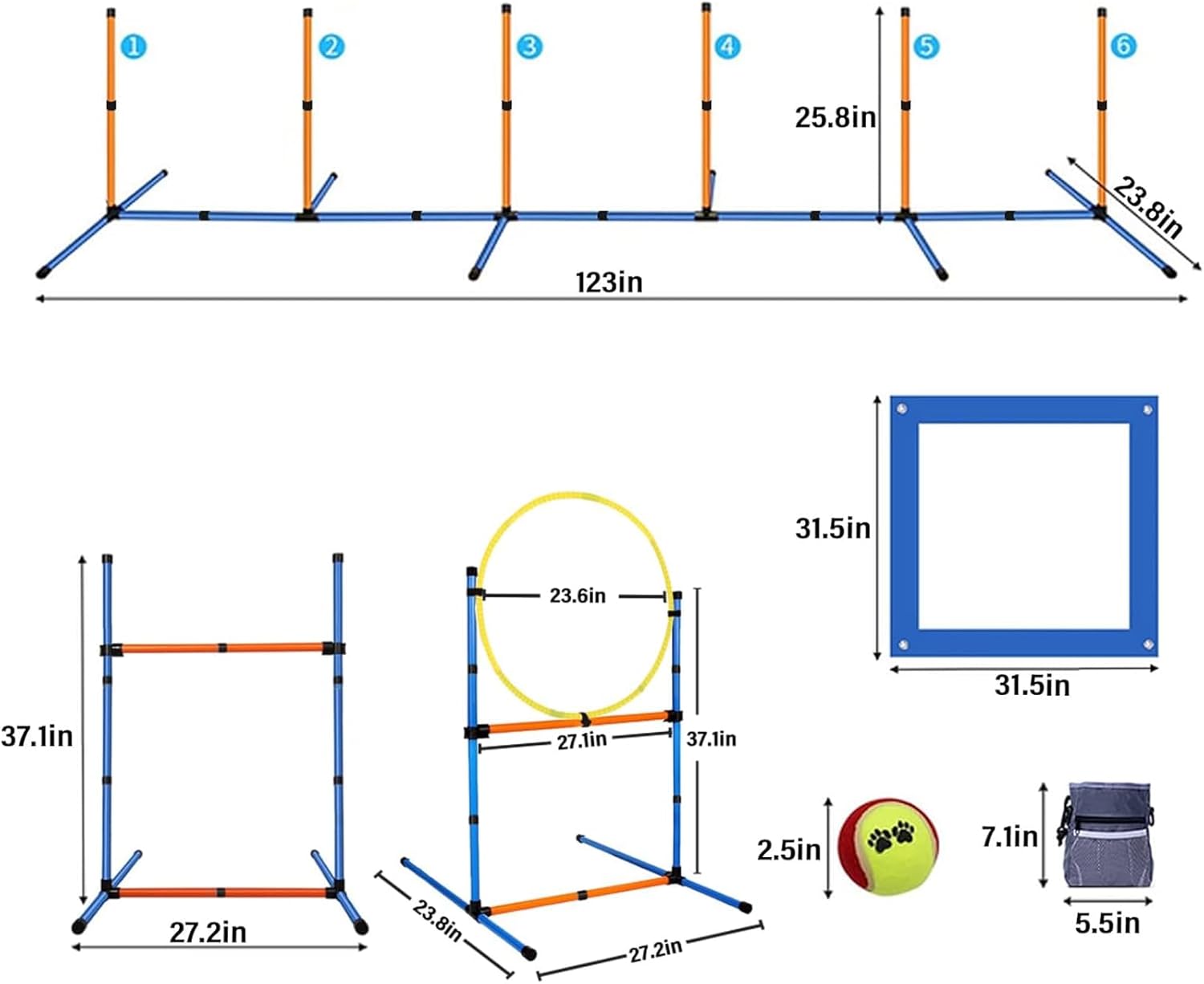 • THE IDEAL GIFT PACKAGE: This doggie agility set makes an exceptional gift for both young and seasoned dog lovers. It includes a square pause box, an adjustable dog agility jump hurdle with pole connectors, a tire jump, weave poles, agility equipment carrying bags, and an instruction sheet for your convenience. With this comprehensive kit, you have everything needed to kickstart an exciting agility training journey with your beloved pup!