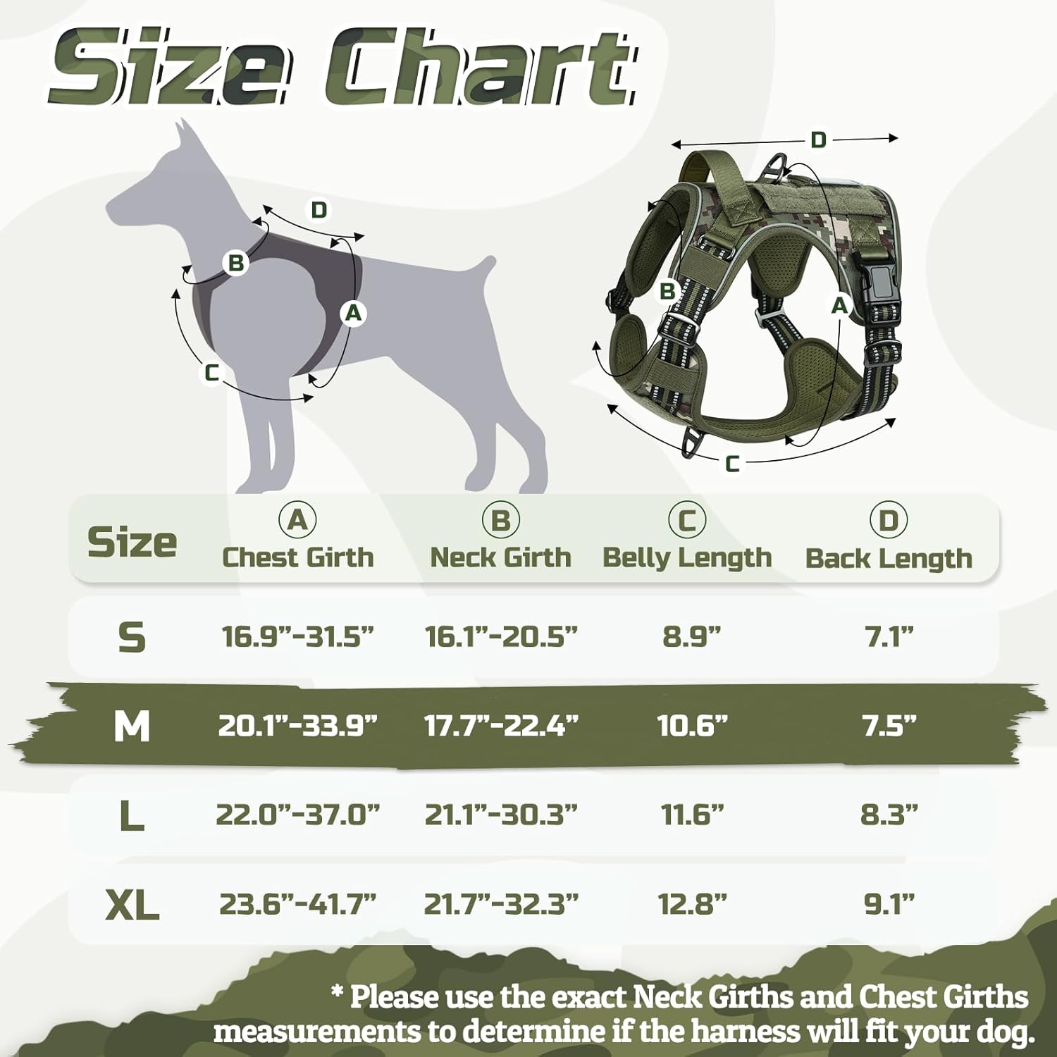 • Medium Tactical Dog Harness: Chest Girth: 20.1"-33.9" (51-86cm), Neck Girth: 17.7"-22.4" (45-57cm), Belly Length: 10.6" (27cm), Back Length: 7.5" (19cm). Ideal for Pitpull, Boxer, Cane Corso, Labradoodle, Australian Shepherd, Corgi, Bull Terrier, Cairn Terrier, etc