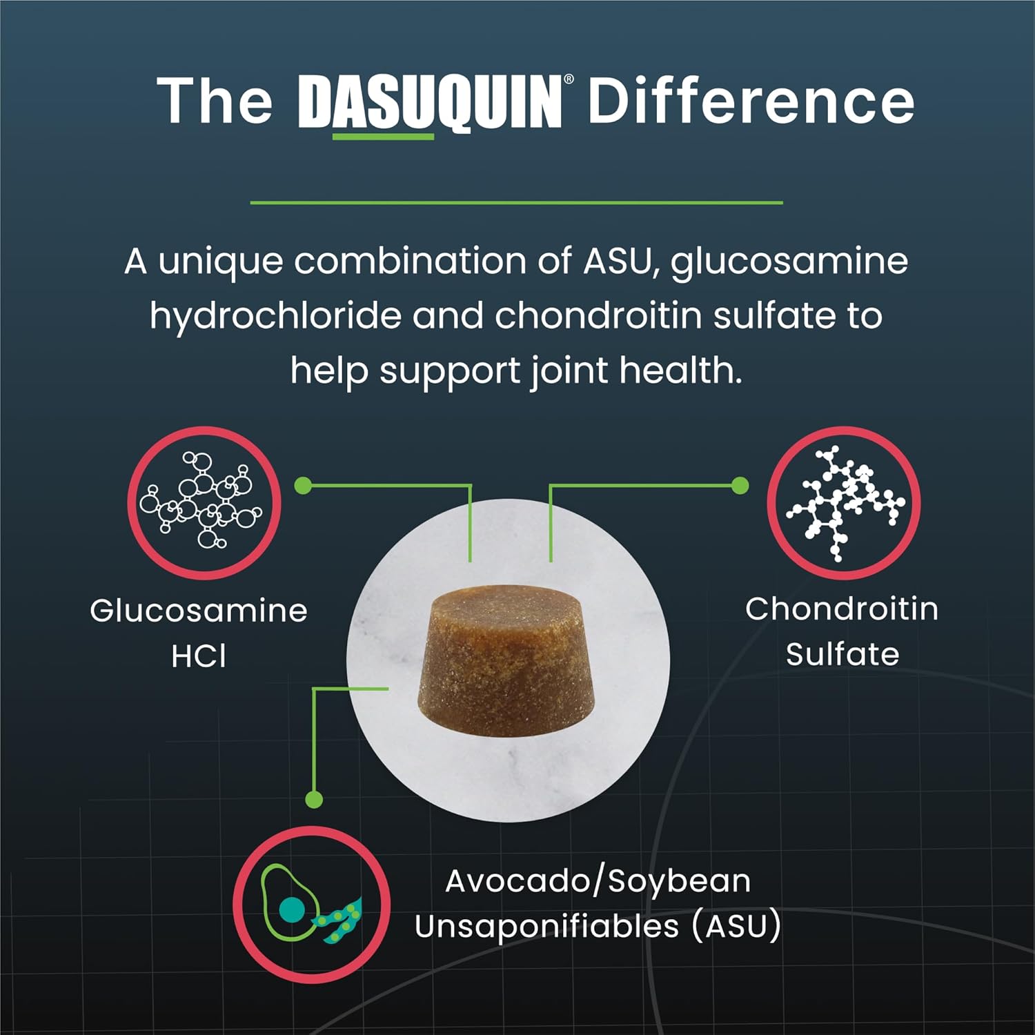 • Joint Health Support for Senior Dogs: Dasuquin, the #1 veterinarian recommended joint health supplement brand◆, contains avocado/soybean unsaponifiables (ASU), glucosamine hydrochloride, and sodium chondroitin sulfate that work better together to support joint health in dogs