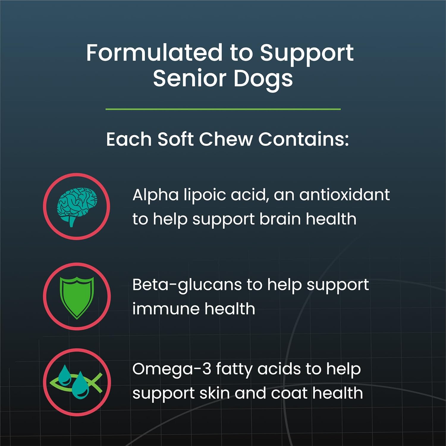 • Omega-3 Fatty Acids and Beta-Glucans: Each soft chew contains omega-3 fatty acids to help support skin and coat health and beta-glucans for immune support