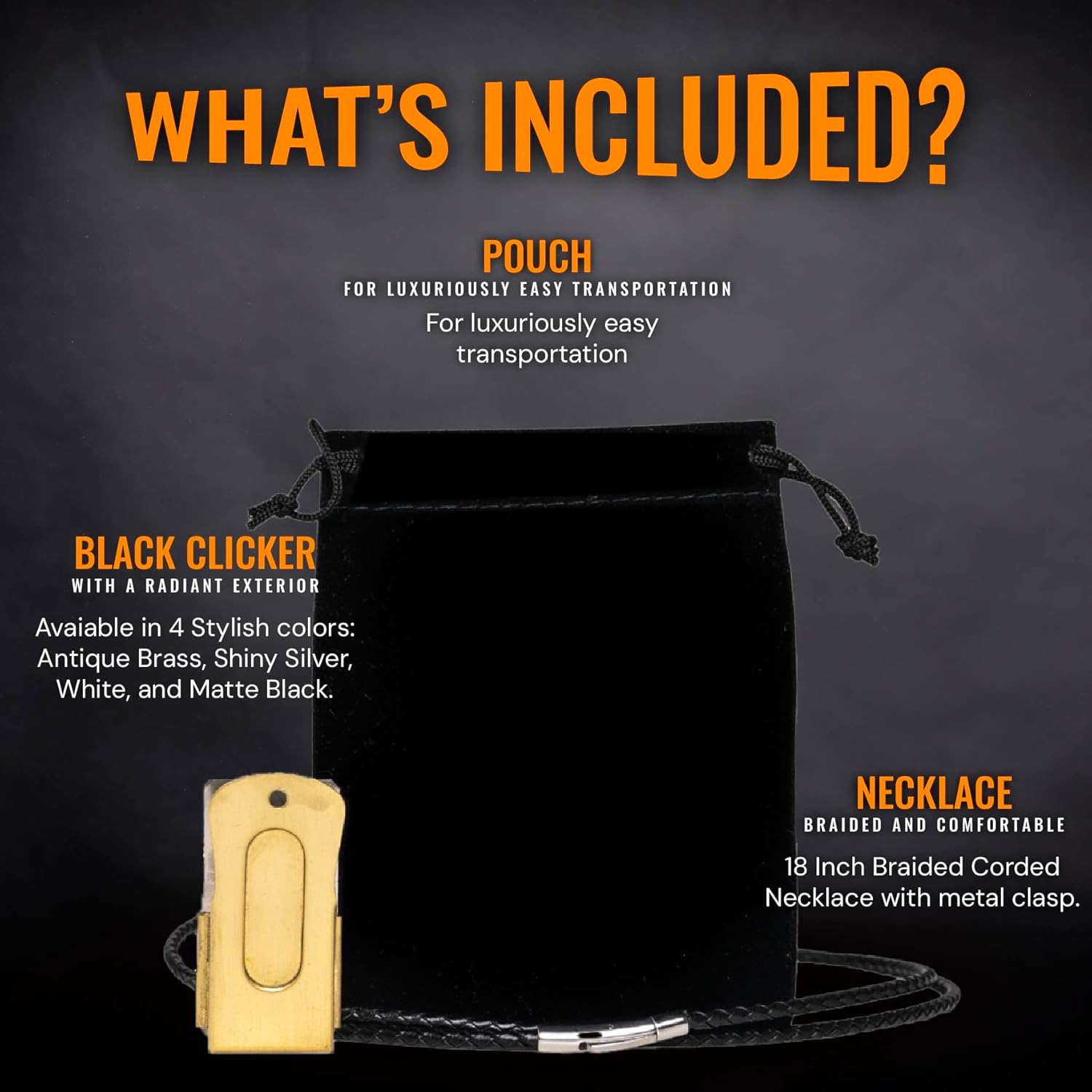 • Stand Out with Class: In a sea of ordinary clickers, our elegant Gold Puppy Training Clicker sets you apart. Embrace sophistication and style while improving your dog agility. Our dog accessories clicker product has a black exterior and also features a braided leather necklace with a magnetic metal clasp that matches your style perfectly