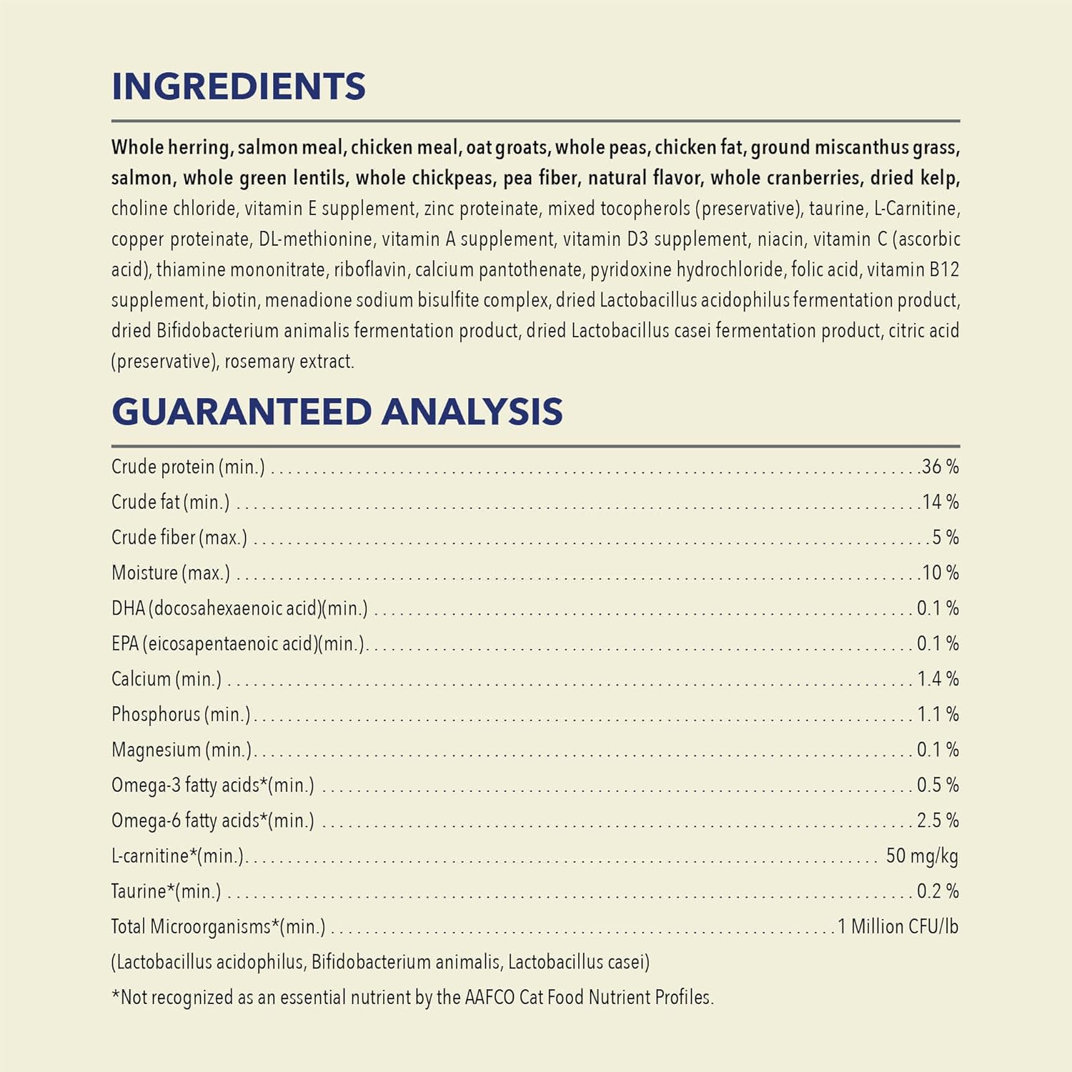• This cat food is crafted with 65% animal ingredients*, including whole herring and raw salmon.