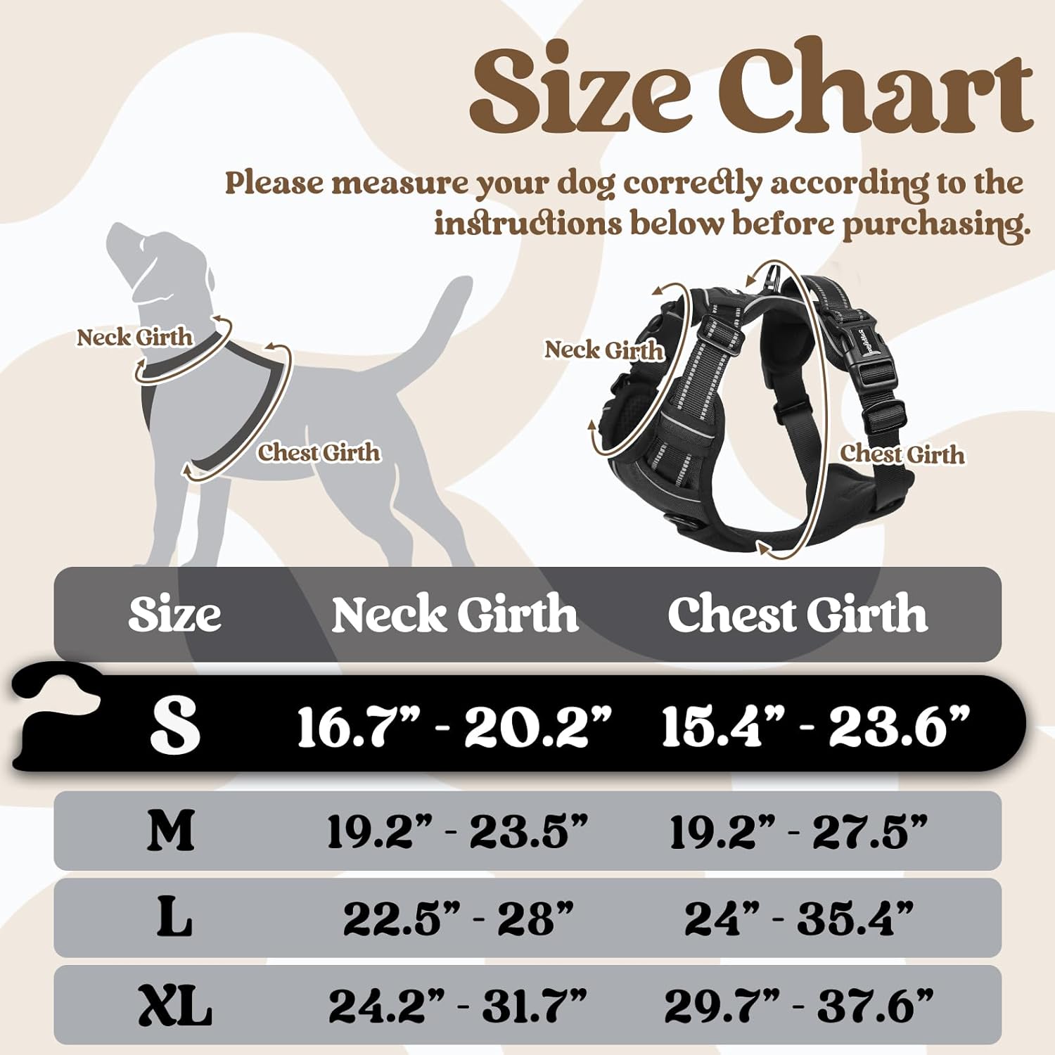• Create a Snug Fit: 4 fully adjustable straps suit most breeds, fitting while allowing freedom of movement. The adjustable two chest straps and two neck straps were created specifically for dogs going through a fast growth period. Size information: 16.7"- 20.2" Neck Girth, 15.4"- 23.6" Chest Girth