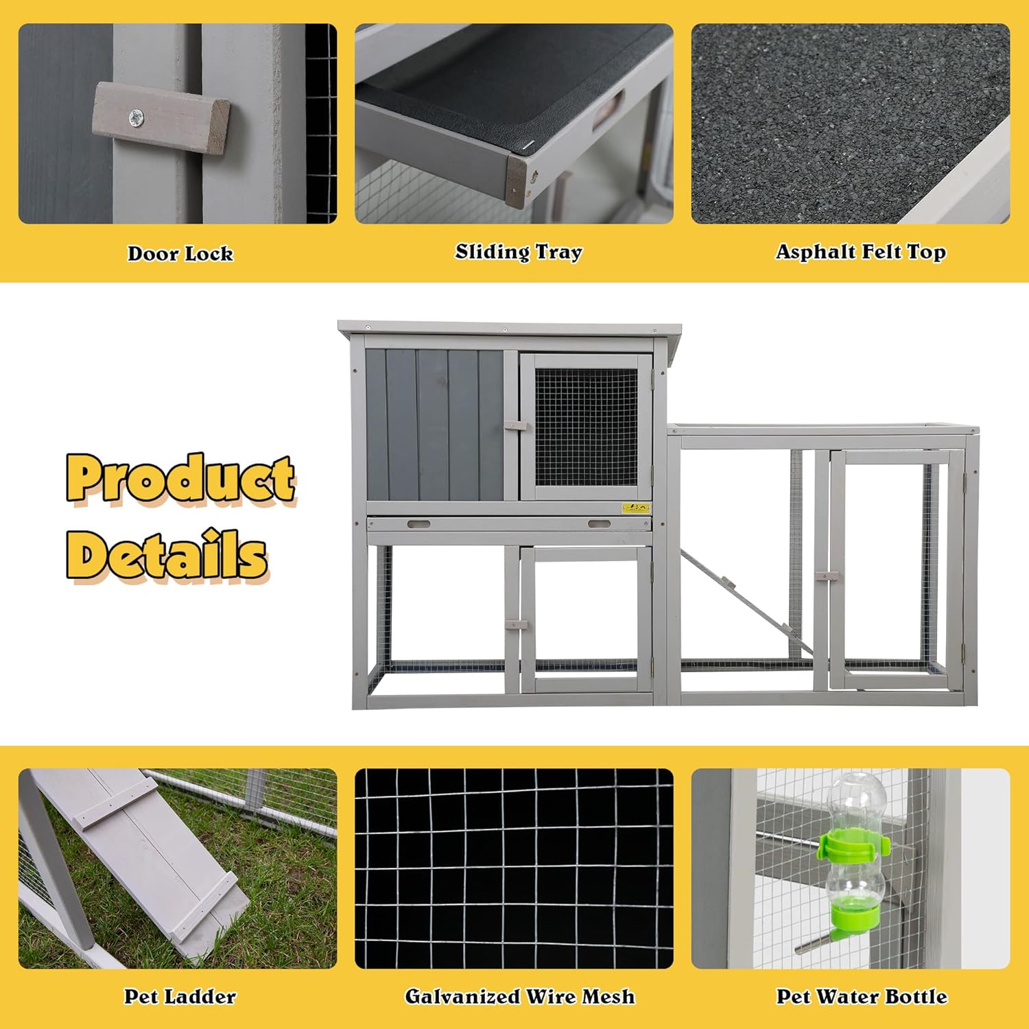 • [Easy to Clean]:The attic of rabbit hutch outdoor is equipped with a sliding tray contributing to provide a comfortable and sanitary environment. The smooth surface and high hardness plastic can be cleaned by rinsing with water only. An openable roof and two front doors for easily cleaning and feeding.