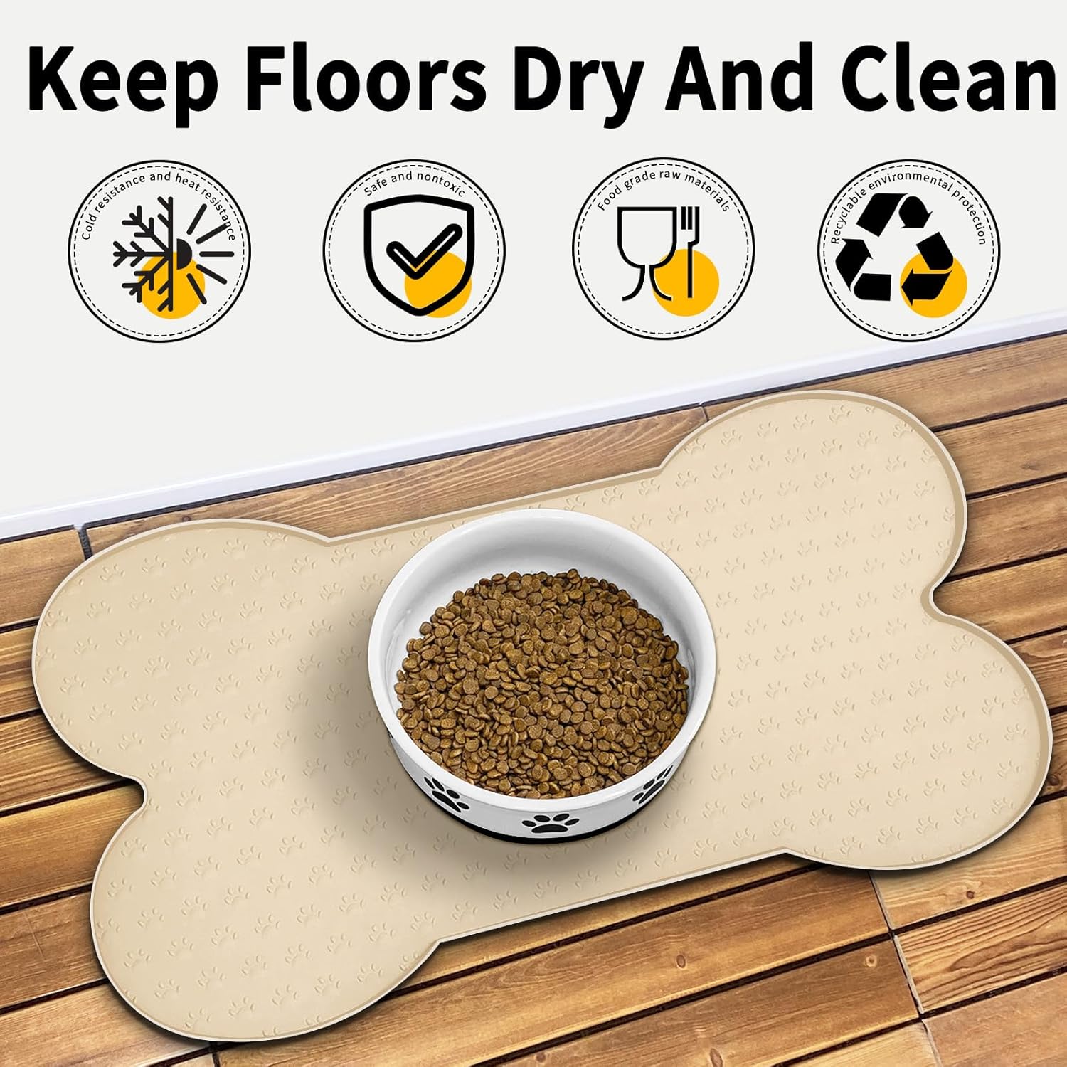 • Raised Edge - The high edge of this feeder mat keeps food and water within the tray and prevents spillage onto a clean floor. Keep your living space tidy and clean, say goodbye to messy floors, you just need to clean the dog bowl mat regularly.