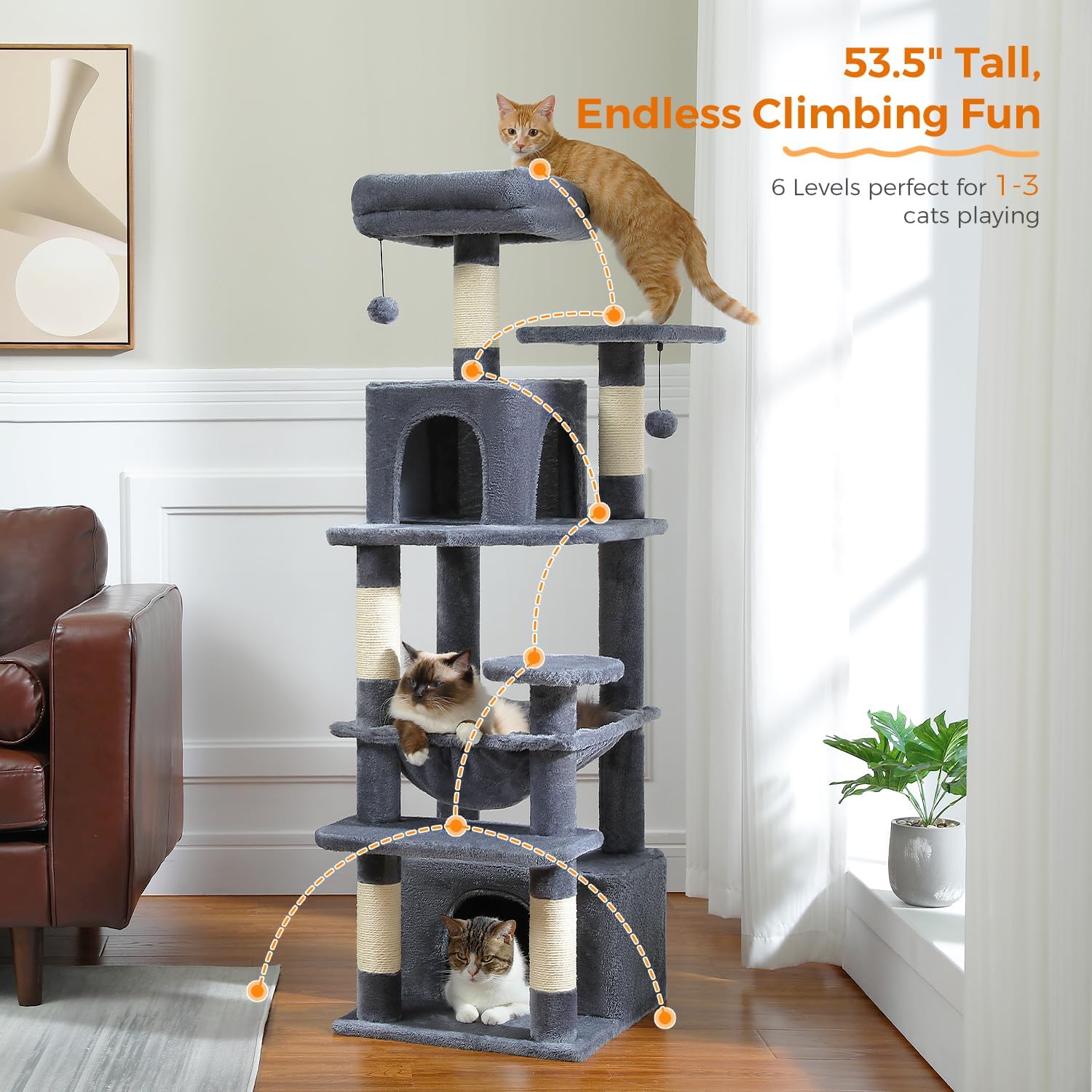 • 53" Tall, Endless Climbing Fun: With the total height of 53.5 inches, the cat tree is perfect for cats who love climbing up and down. Your cats can freely go through the condos, jump to the platform, sleep in the spacious hammock, or climb the post to the top perch. The needs of scratching, climbing, sleeping and exercising could fully be satisfied!