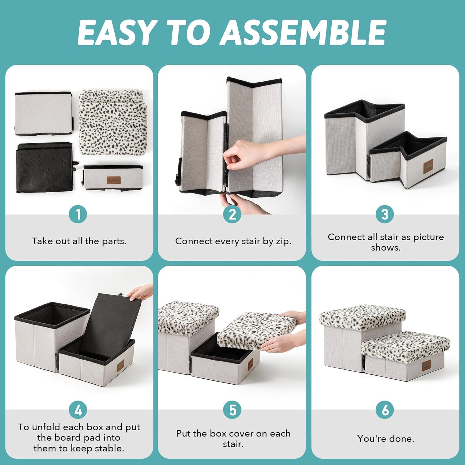 • 【Dog Stairs - Easy to Assemble】First, connect the zipper on each step, then fully unfold each step. Next, place each support board into the corresponding storage box and cover it. When not in use, simply remove the cover and store the stairs after folding them completely. This helps save space, making it ideal for small rooms. You can also watch our installation video in the product description below.