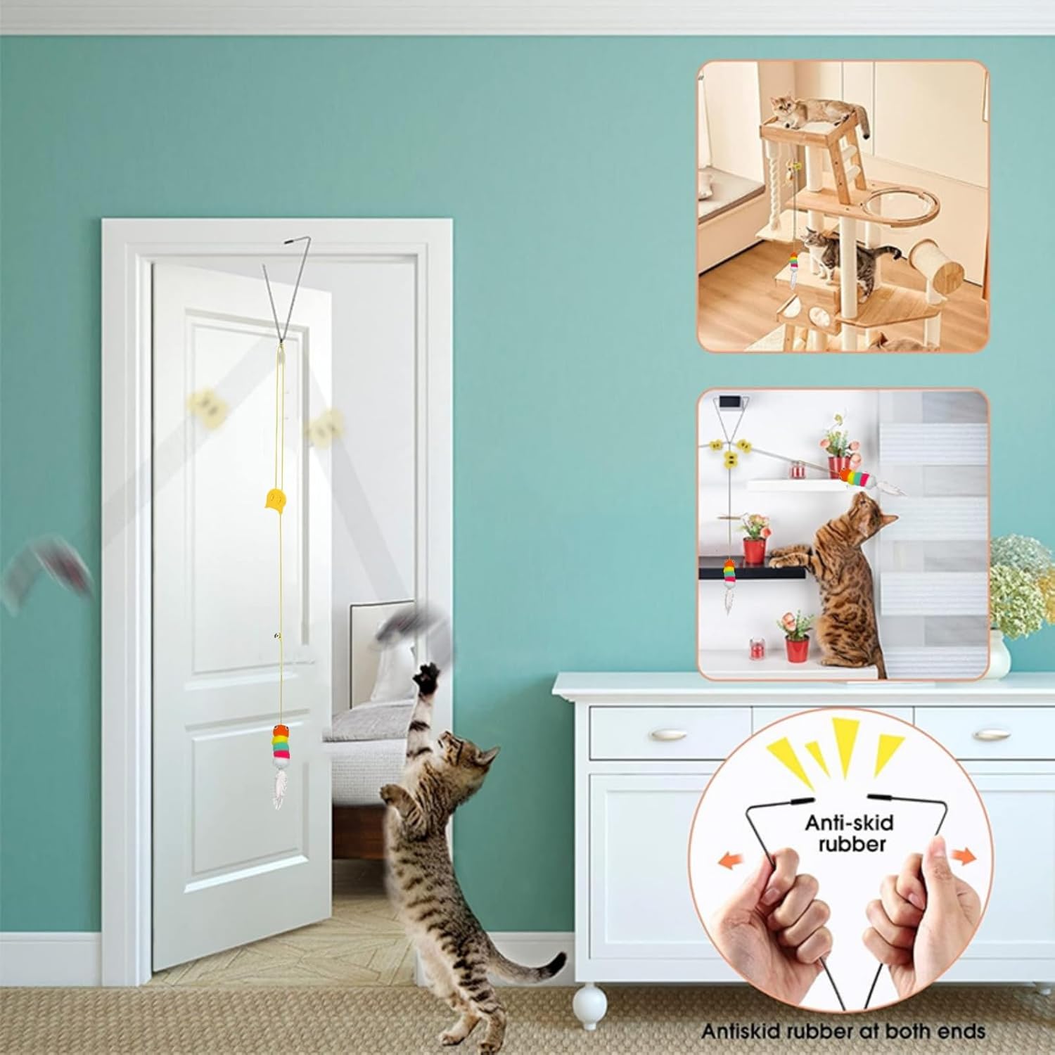 • Hanging Door Cat Toy: These indoor interactive cat toys can be hung on door frames, doors,glass window and so on, can be hung anywhere using stickers or Triangle Hook, whenever your cat touches the hanging kitty toys, the feather cat toys wand will move in a shaking way, the bells on the string will make a clanging sound to attract the cat's attention more, it allows the cat to get exercise and prevent obesity and boredom.