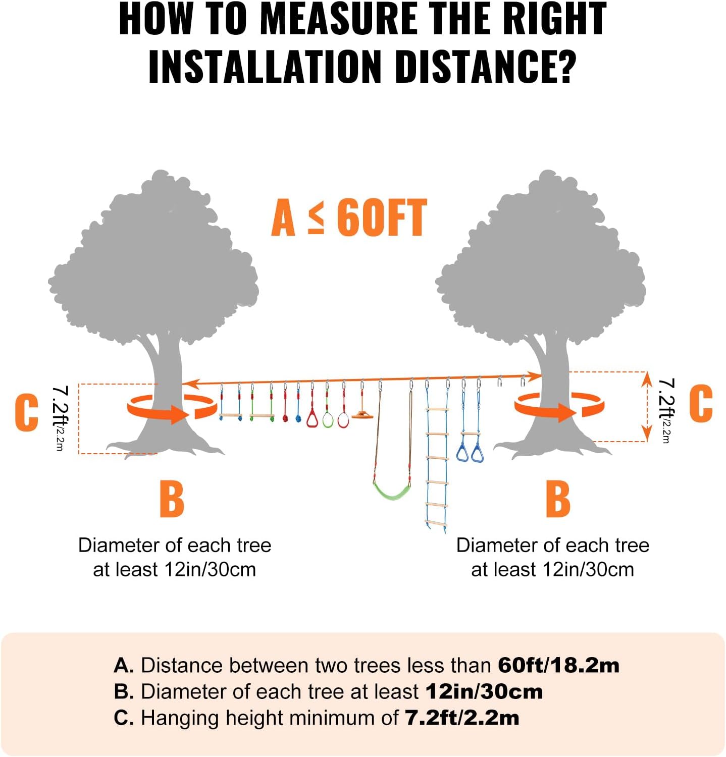 VEVOR Ninja Warrior Obstacle Course for Kids, 2 x 60 ft Weatherproof Slacklines, 500lbs Weight Capacity Monkey Line, Outdoor Playset Equipment, Backyard Toys Training Equipment Set with 14 Obstacles