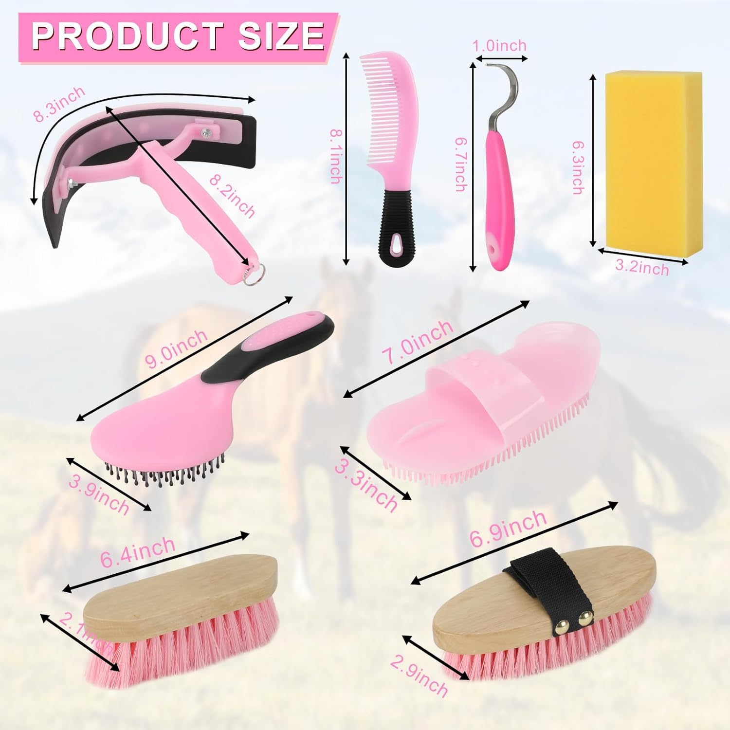• 9 Pieces package contains:The horse grooming supplies, includes a horse grooming tote bag, a oval massage curry, a hard brush, a soft brush, a sweat scraper, bathing sponge, a hoof pick , a mane comb and a tail comb