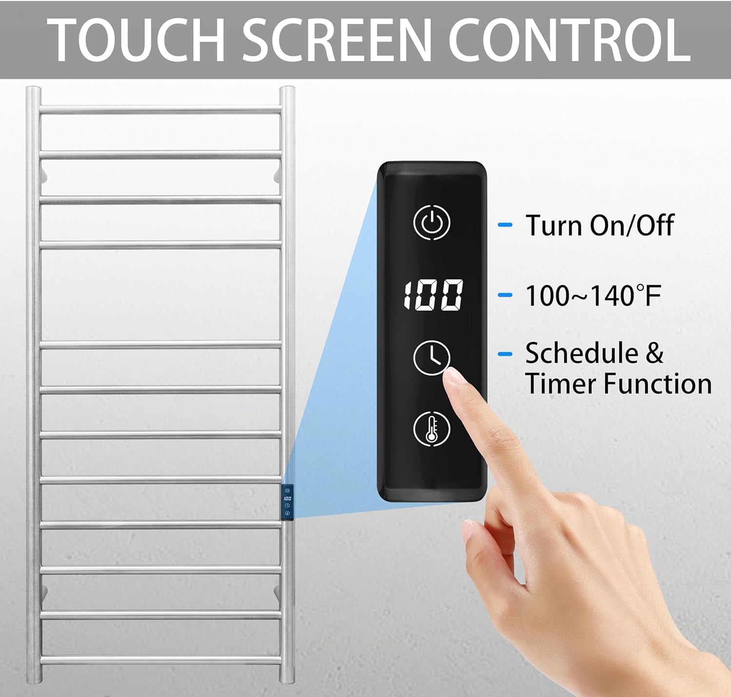 • [PREMIUM QUALITY WITH ELEGANT LOOK]: The bath towel warmer is made of durable 304 stainless steel, easy to clean and durable use. IP56 Waterproof standard and wall-mounted design maximizes your floor space.