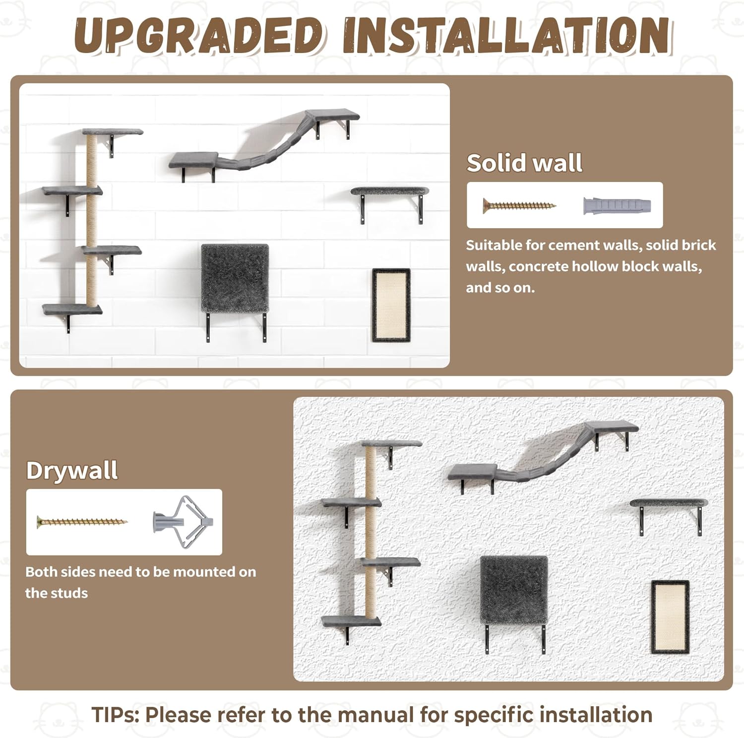 • Safe & Heavy-Duty Construction: Every cat wall-mounted tree component supports up to 22 lbs, reinforced with triangular metal brackets. Smooth, burr-free edges and optional cat shelves with carpet grey ensure safety for playful cat climbers​​ of all breeds.