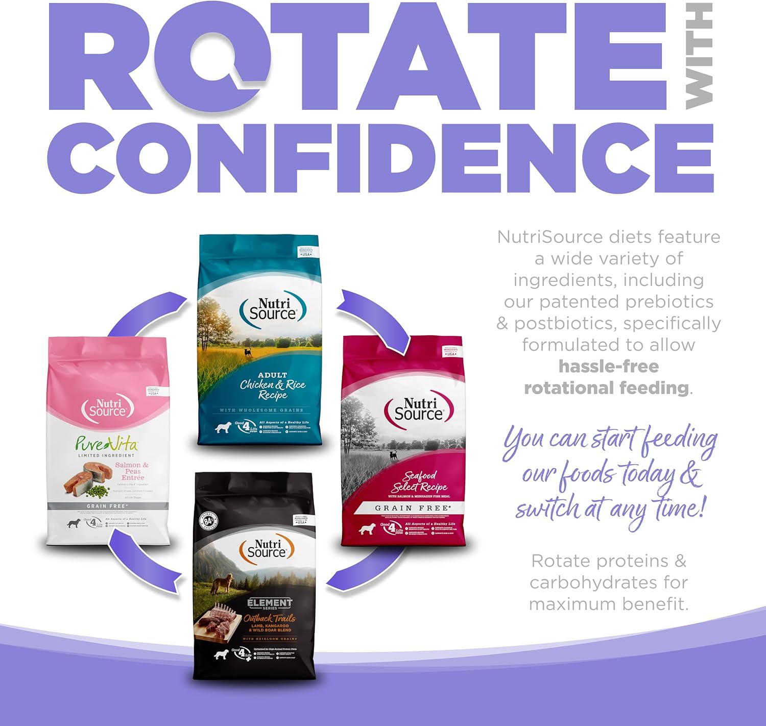 • NutriSource Element Series are high animal protein diets, legume and potato free, delivering maximum nutrient density, along with our proprietary pre- and pro-biotics blend to support digestion and healthy gut function
