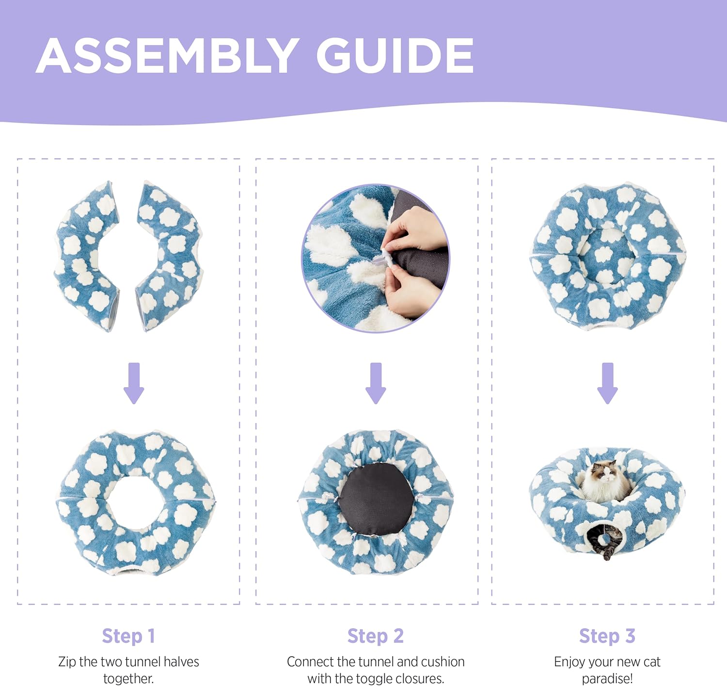 • Hassle-Free Maintenance: Designed with your convenience in mind, this cat tunnel bed is effortless to assemble and quick to store. The removable inner bed is machine washable, ensuring easy clean-up. Plus, the non-slip, studded bottom keeps the tunnel securely in place, providing your pet with a stable and comforting space to relax and play.